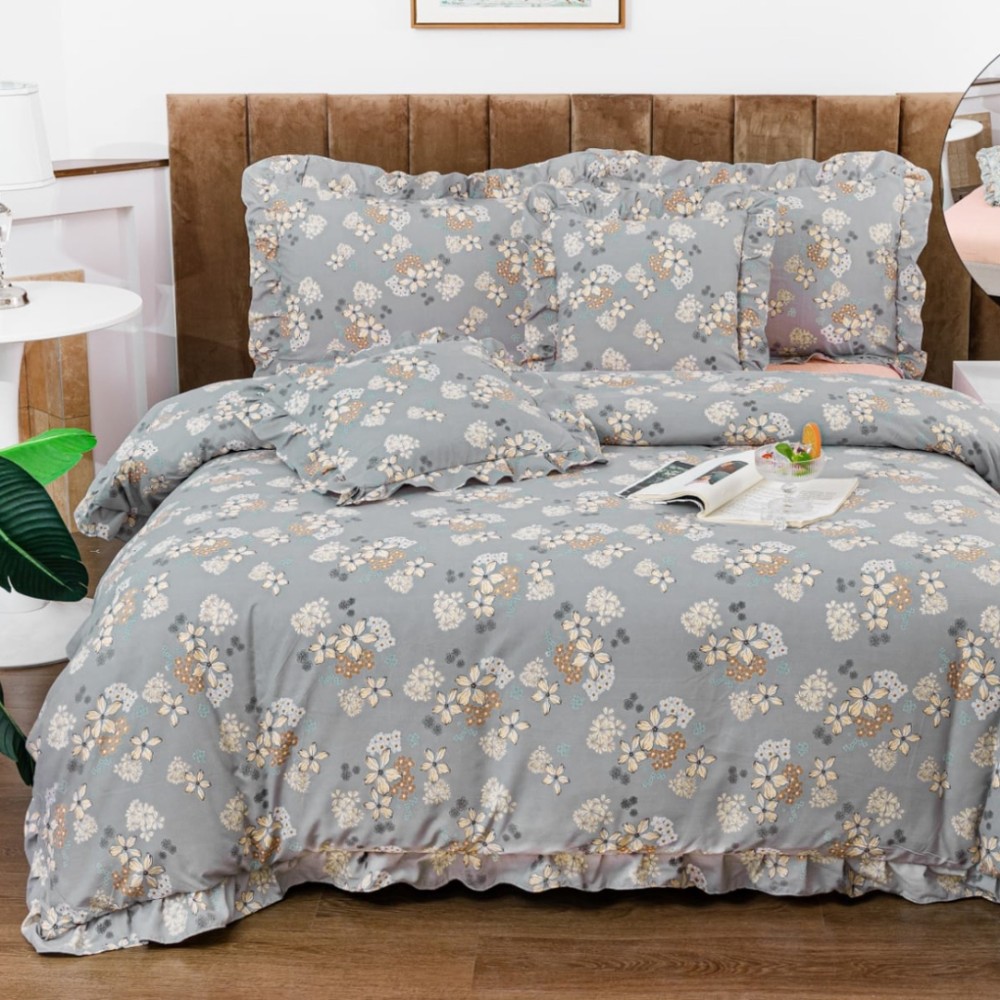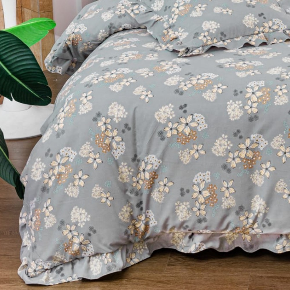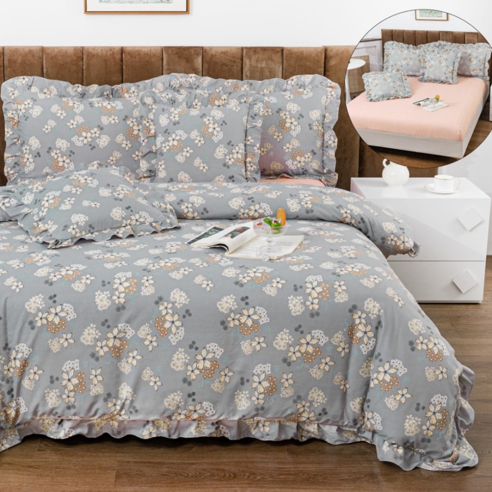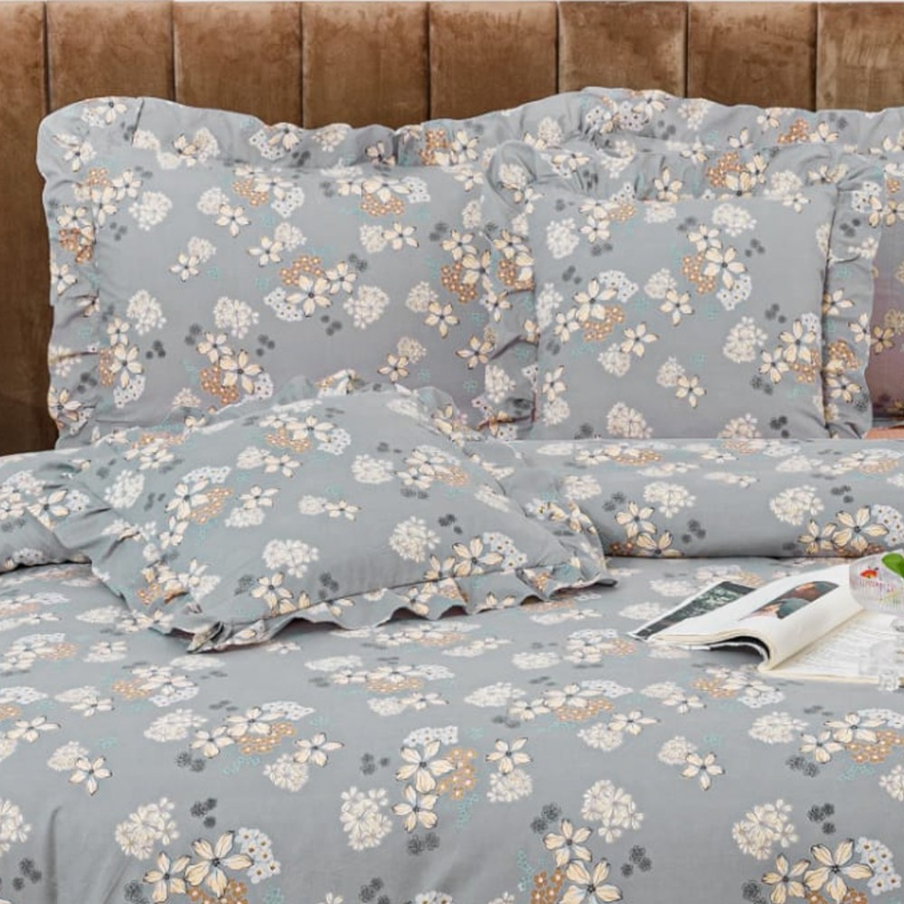 Lenjerie pat dublu, Finet cu Volanase, CEARSAF CU ELASTIC, 6 piese, Gri, Flori, Casa Minunata, cod produs: INS-BFV06