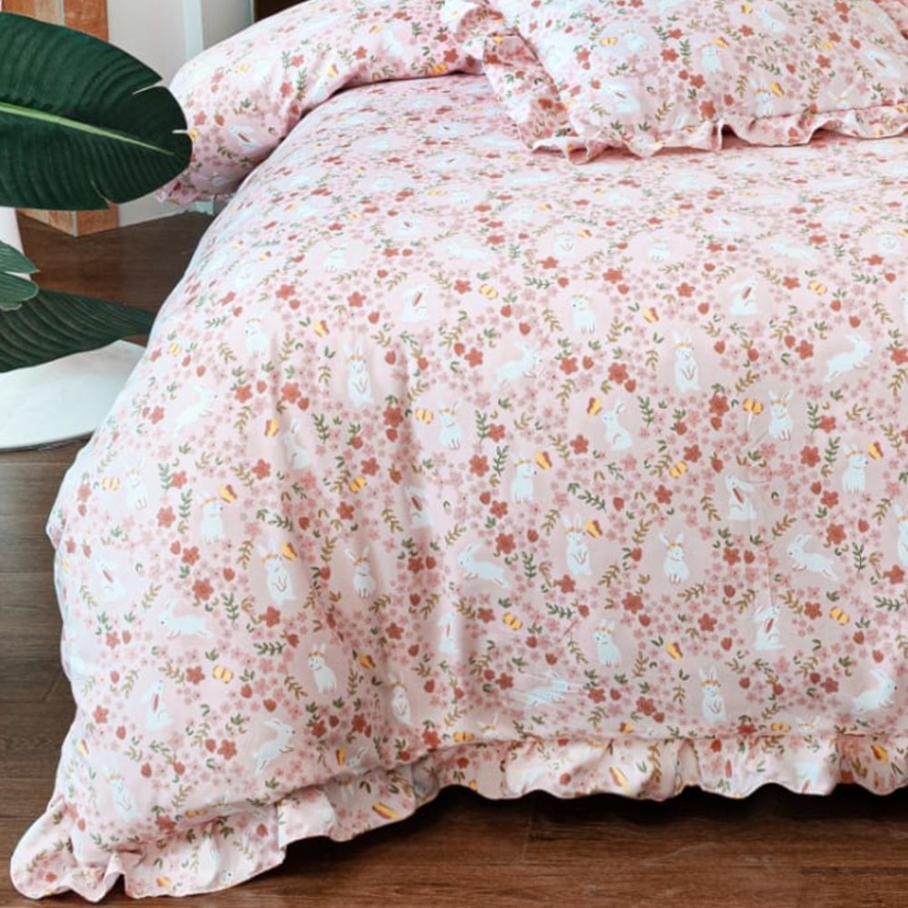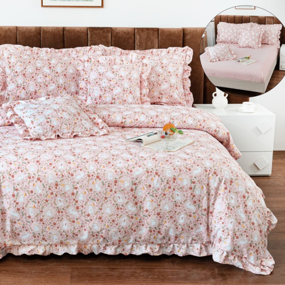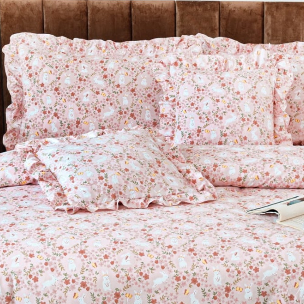 Cu volănașe fine și ușor încrețite pe cearșaful de pilotă și fețele de pernă, acest set transformă orice pat într-un spațiu sofisticat și primitor. Cearșaful de pat cu elastic se fixează perfect pe saltea, asigurând stabilitate și confort pe durata nopții.