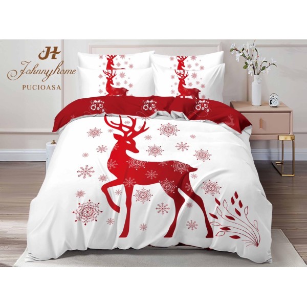 Lenjerie pat dublu, FINET, Digital Print, Craciun, Alb, Roșu, ren, Johny Home Pucioasa, cod produs: SPR-Q2-29