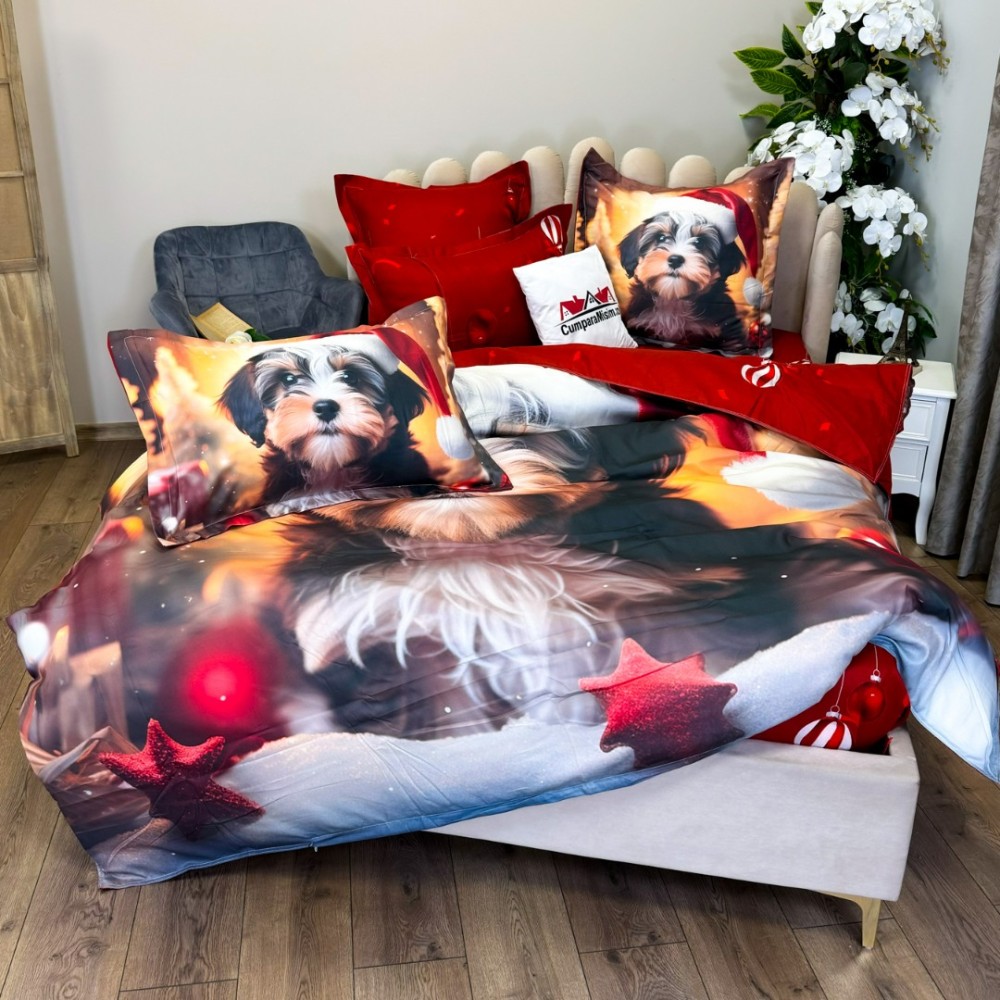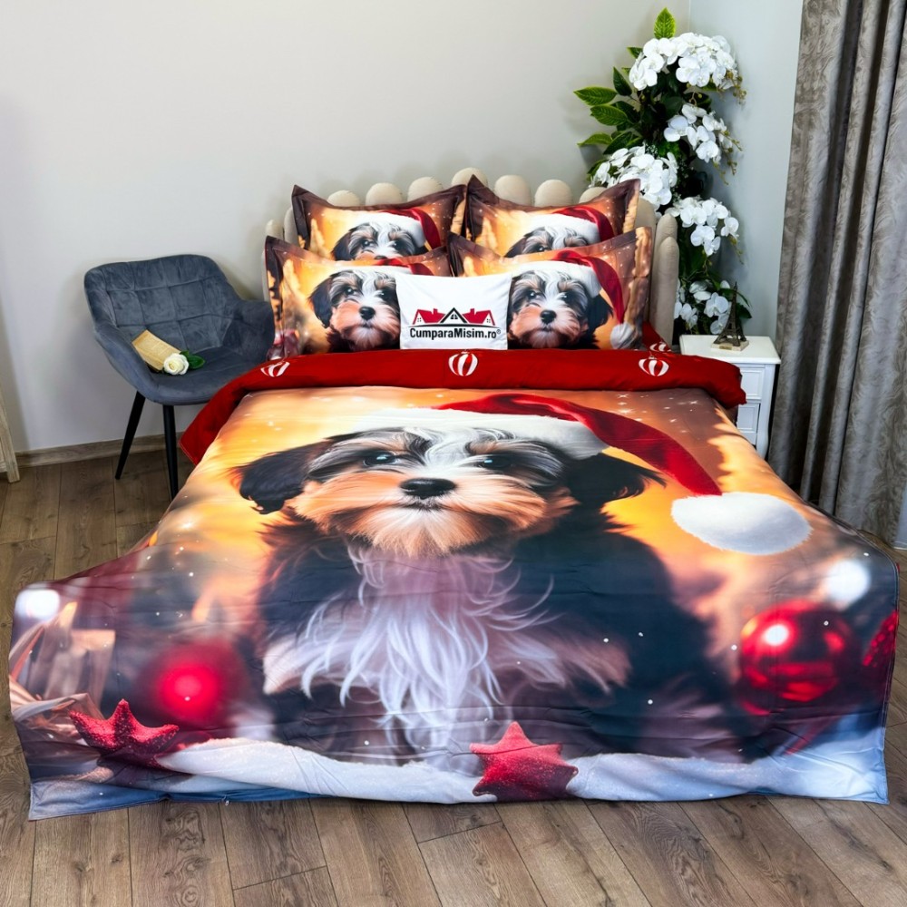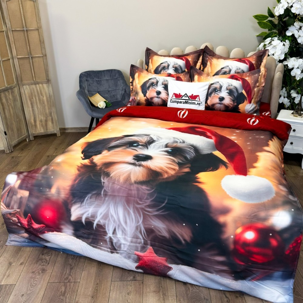 Lenjerie pat dublu, FINET, Digital Print, Craciun, Bej, Roșu, cățel, bichon, Johny Home Pucioasa, cod produs: SPR-Q2-03