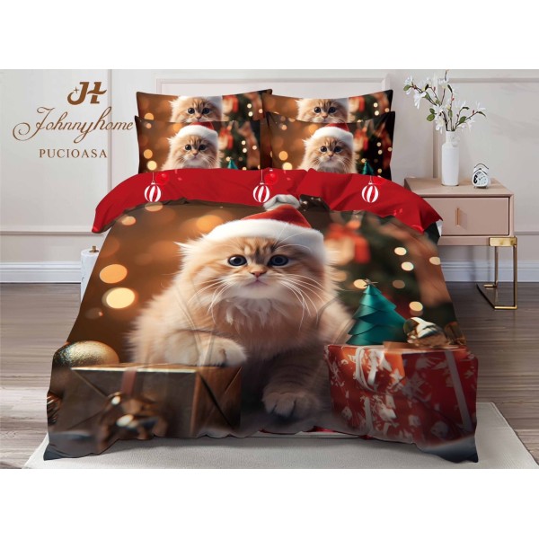 Lenjerie pat dublu, FINET, Digital Print, Craciun, Bej, Roșu, pisicuta, Johny Home Pucioasa, cod produs: SPR-Q2-04