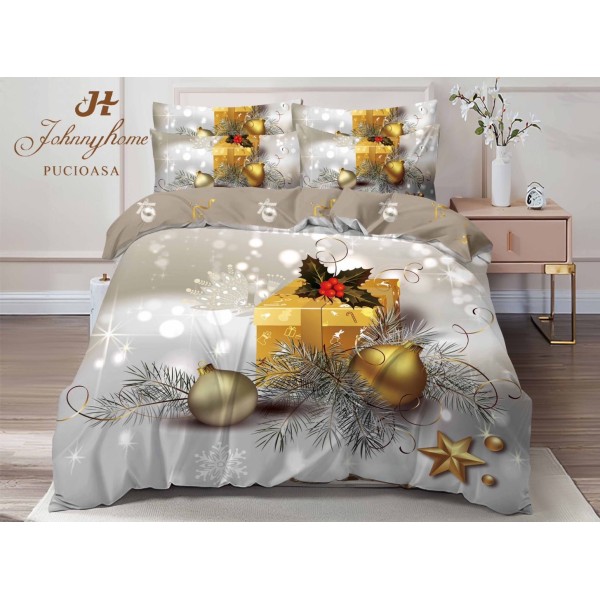 Lenjerie pat dublu, FINET, Digital Print, Craciun, Gri, Auriu, cadouri, Johny Home Pucioasa, cod produs: SPR-Q2-12