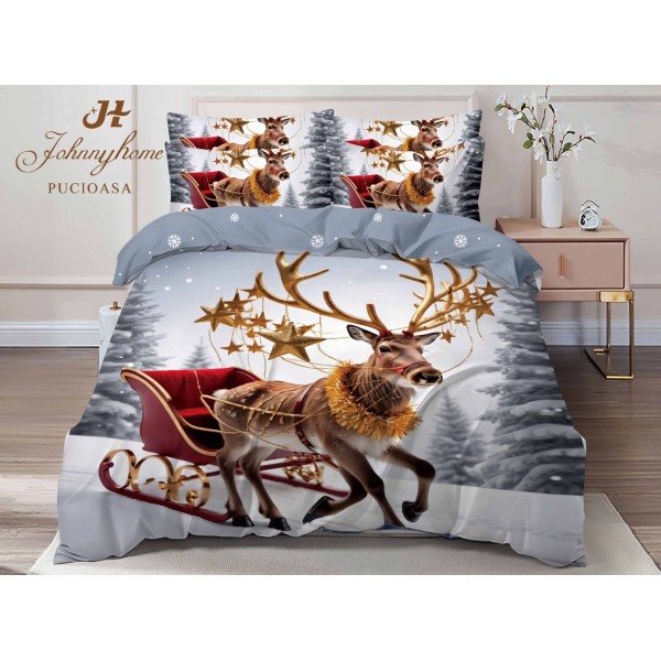 Lenjerie pat dublu, FINET, Digital Print, Craciun, Gri, Roșu, Maro, sania lui Moș Crăciun, ren, Johny Home Pucioasa, cod produs: SPR-Q2-19