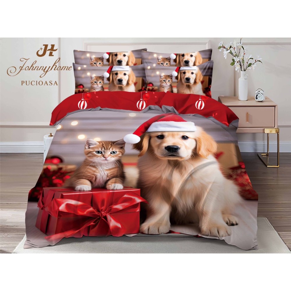 Lenjerie pat dublu, FINET, Digital Print, Craciun, Gri, Roșu, pisica, cățel, golden retriever, Johny Home Pucioasa, cod produs: SPR-Q2-09