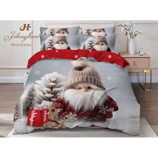 Lenjerie pat dublu, FINET, Digital Print, Craciun, Gri, Roșu, spiridușul lui Moș Crăciun, Johny Home Pucioasa, cod produs: SPR-Q2-37