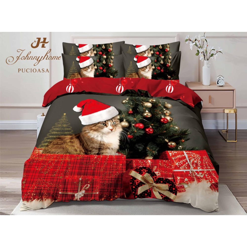 Lenjerie pat dublu, FINET, Digital Print, Craciun, Rosu, Maro, pisicuță, brad, Johny Home Pucioasa, cod produs: SPR-Q2-01