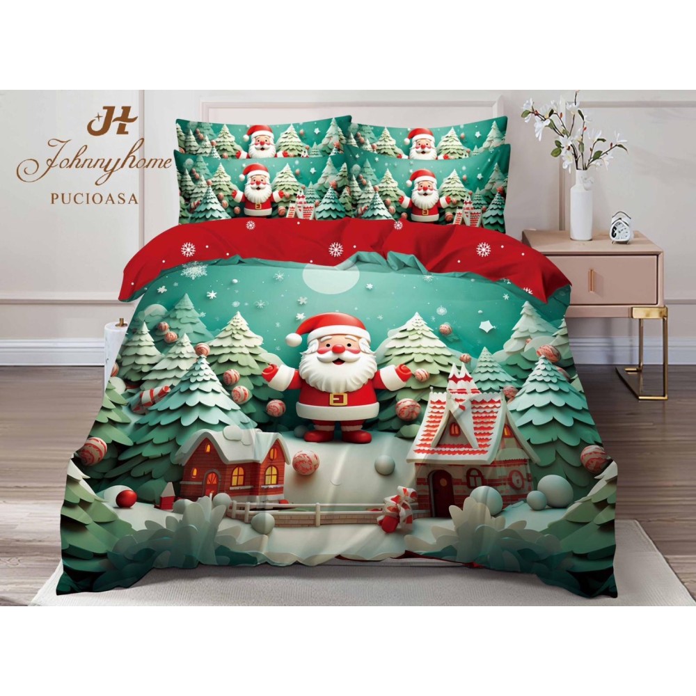 Lenjerie pat dublu, FINET, Digital Print, Craciun, Verde, Alb, Roșu, orașul lui Moș Crăciun , Johny Home Pucioasa, cod produs: SPR-Q2-30