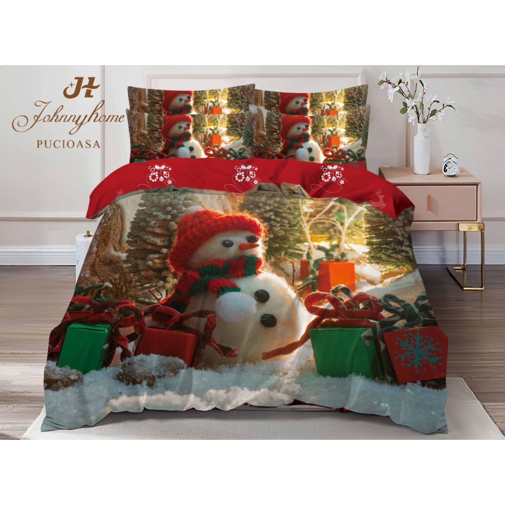 Lenjerie pat dublu, FINET, Digital Print, Craciun, Verde, Roșu, om de zăpadă, cadouri, Johny Home Pucioasa, cod produs: SPR-Q2-26