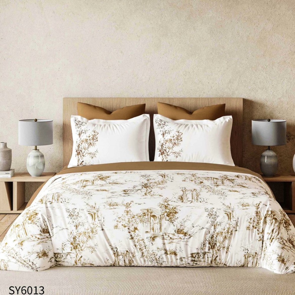 Lenjerie pat dublu, FINET, Imprimeu Digital, cu ELASTIC, Alb, Maro, Arcul de Triumf, Plante, Primavara Casa, cod produs: PRM-FD-SY6013