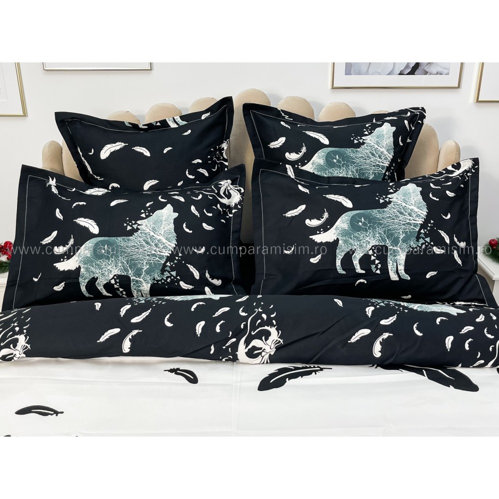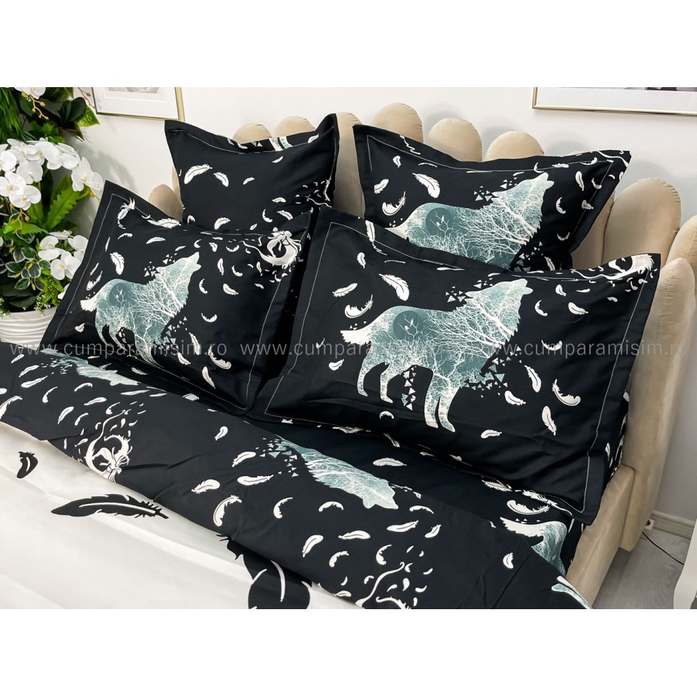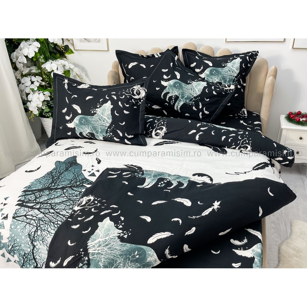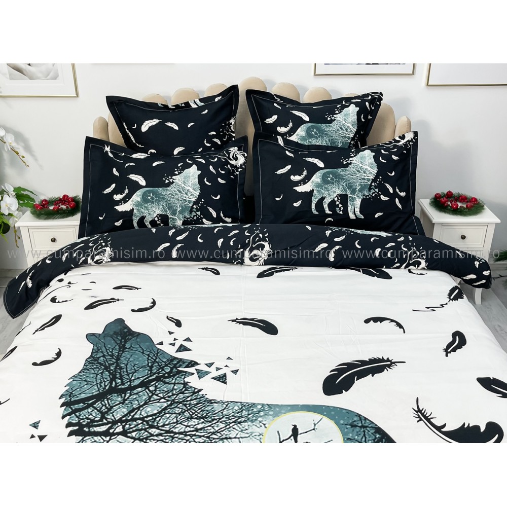 Lenjerie pat dublu, FINET, Imprimeu Digital - Identic cu poza, 6 piese, Jojo Home, Alb-Bleumarin, lup, pene, cod produs: JOF512