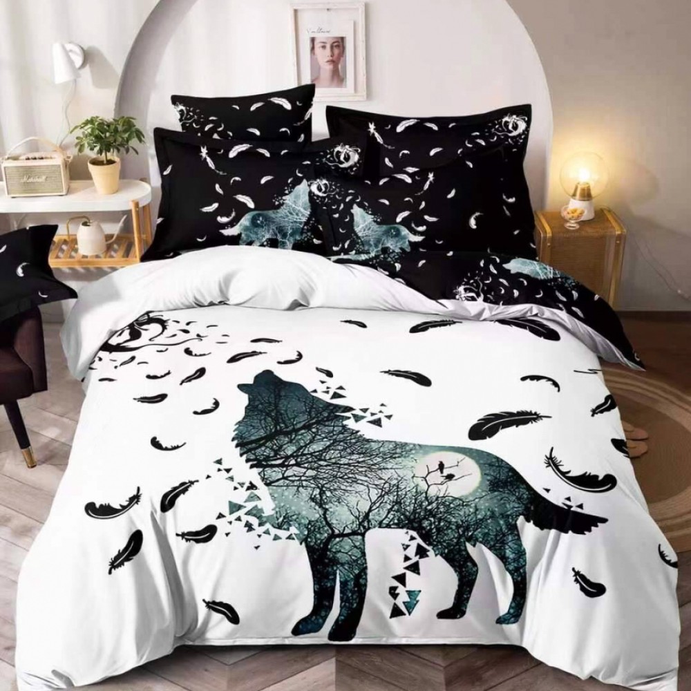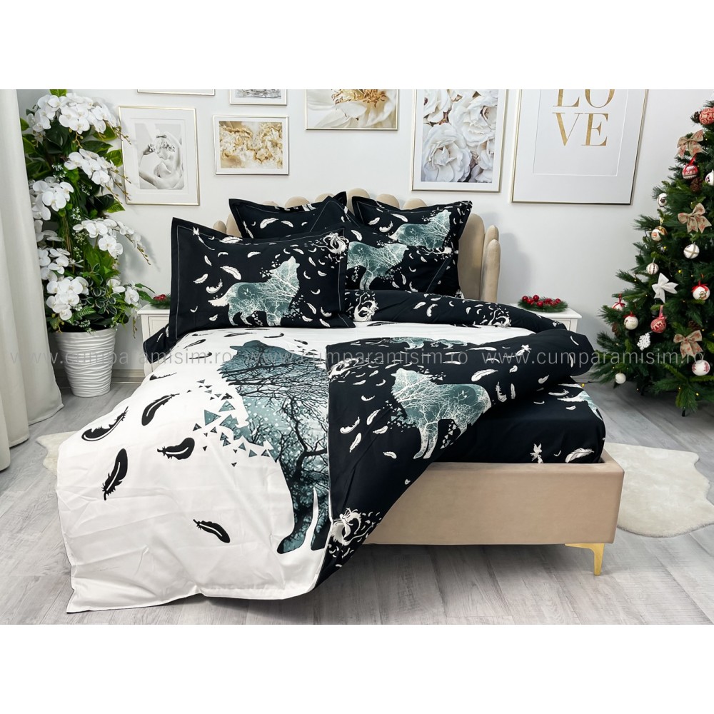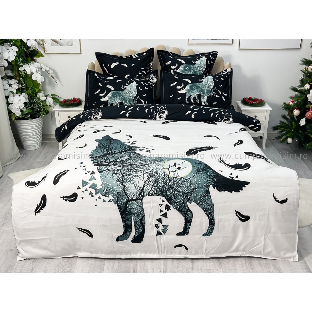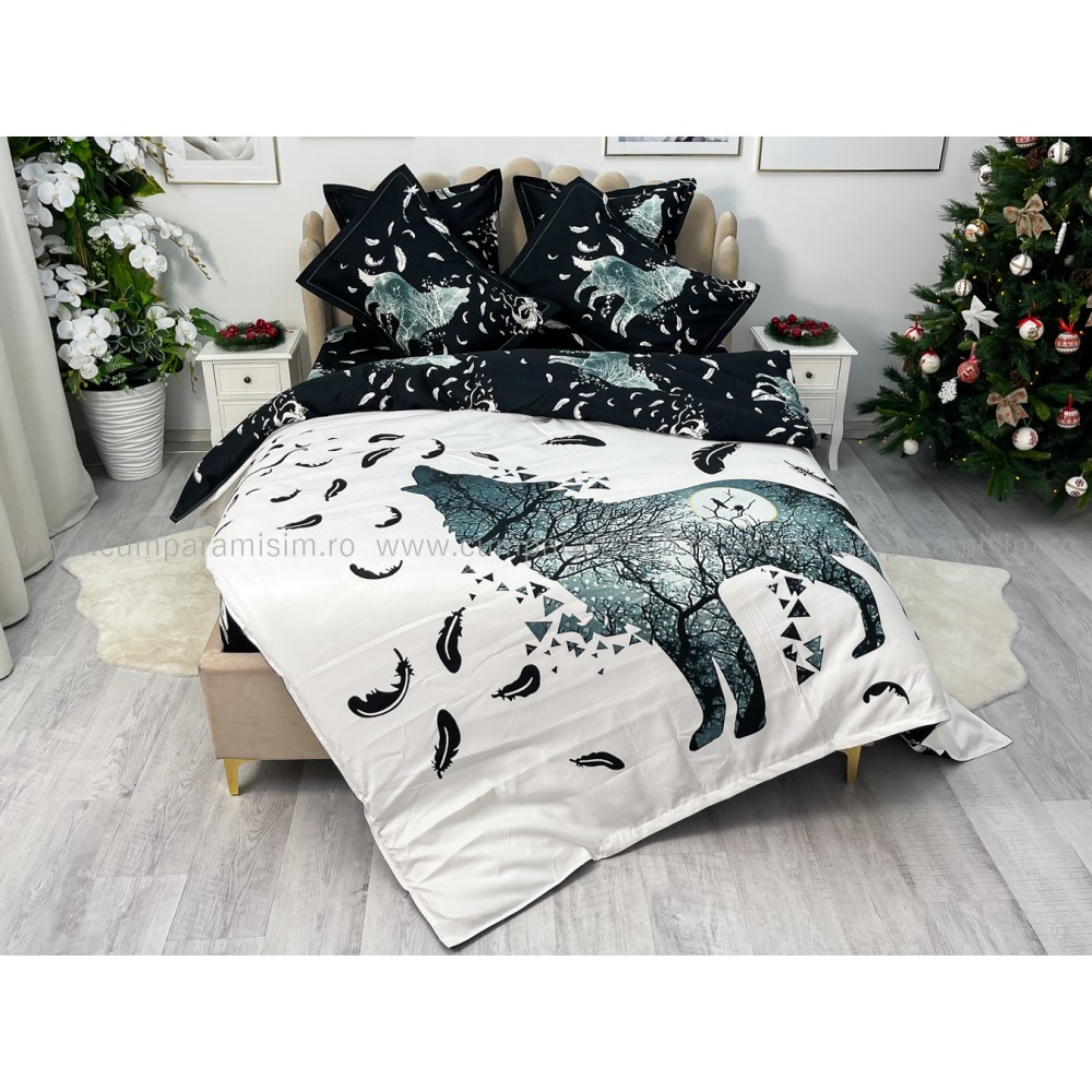 Lenjerie pat dublu, FINET, Imprimeu Digital - Identic cu poza, 6 piese, Jojo Home, Alb-Bleumarin, lup, pene, cod produs: JOF512