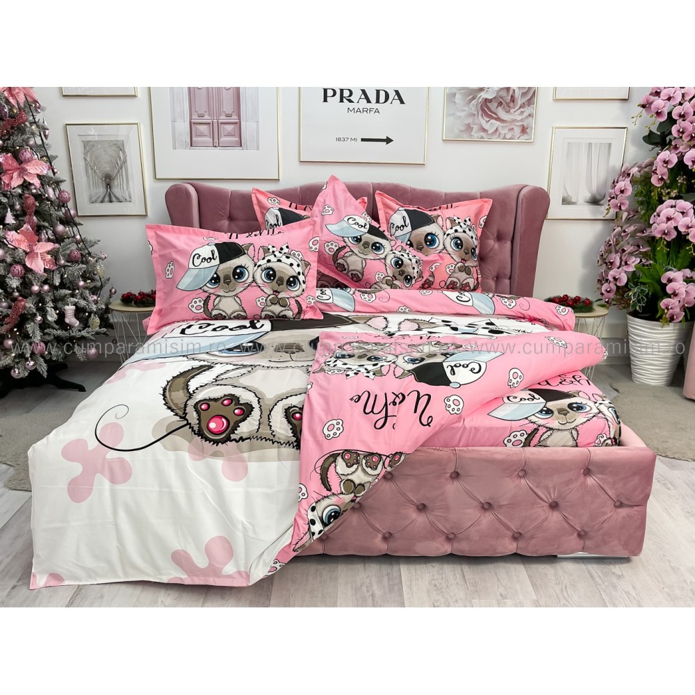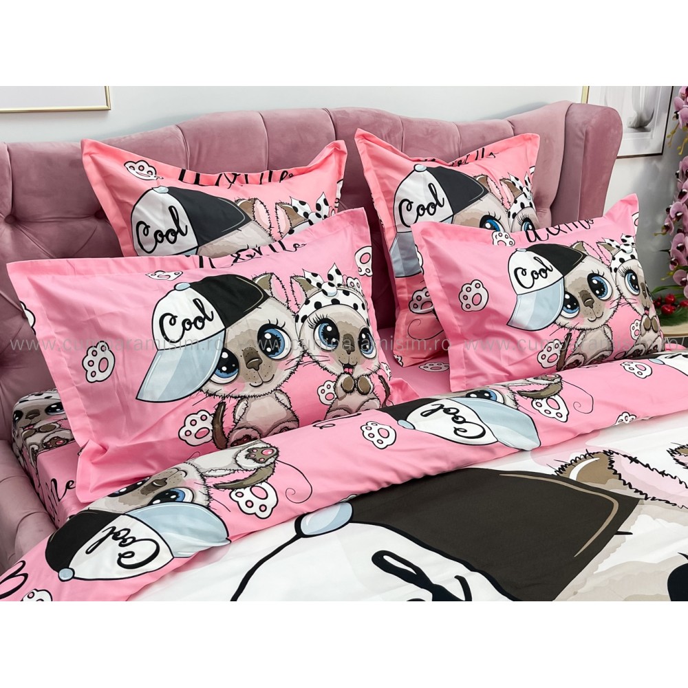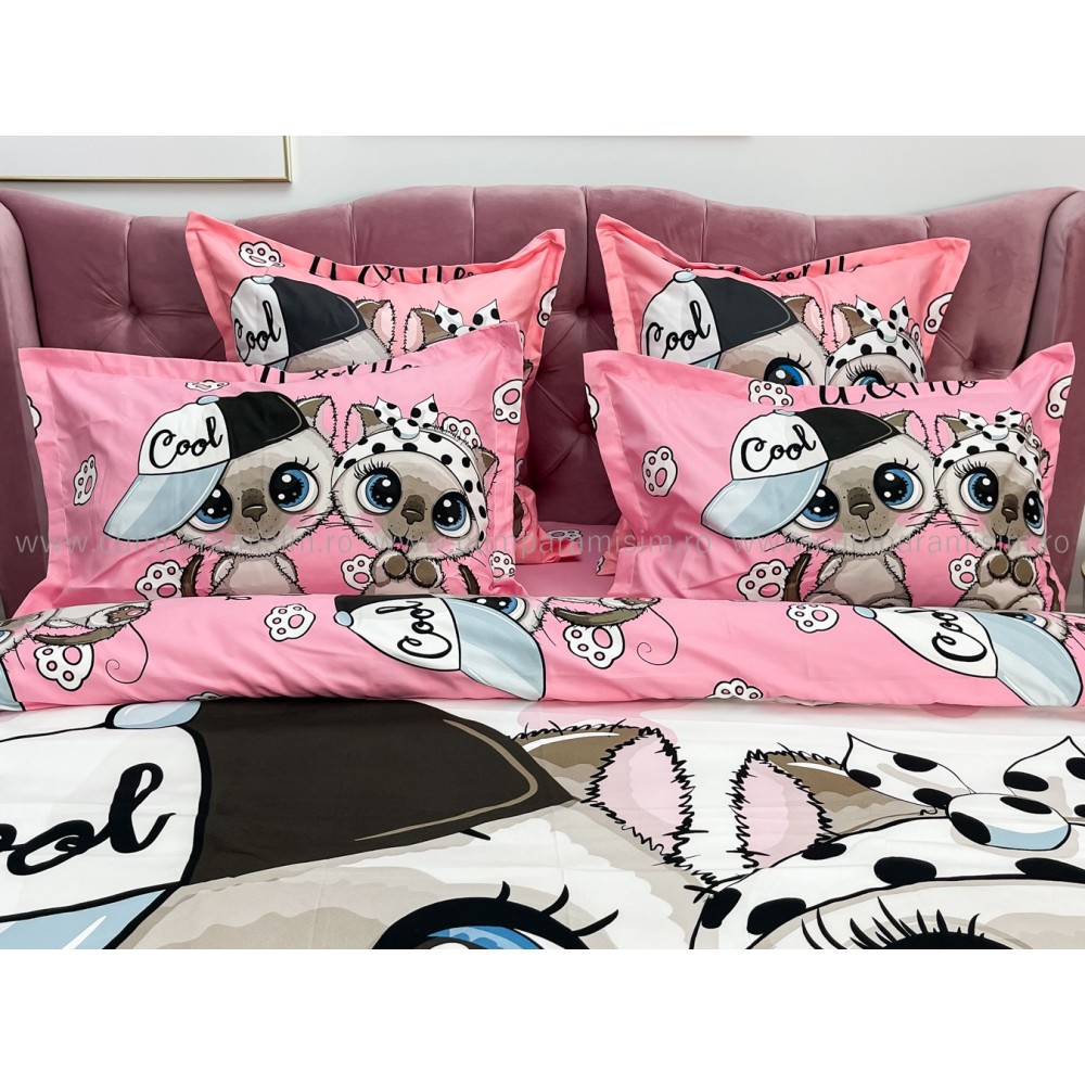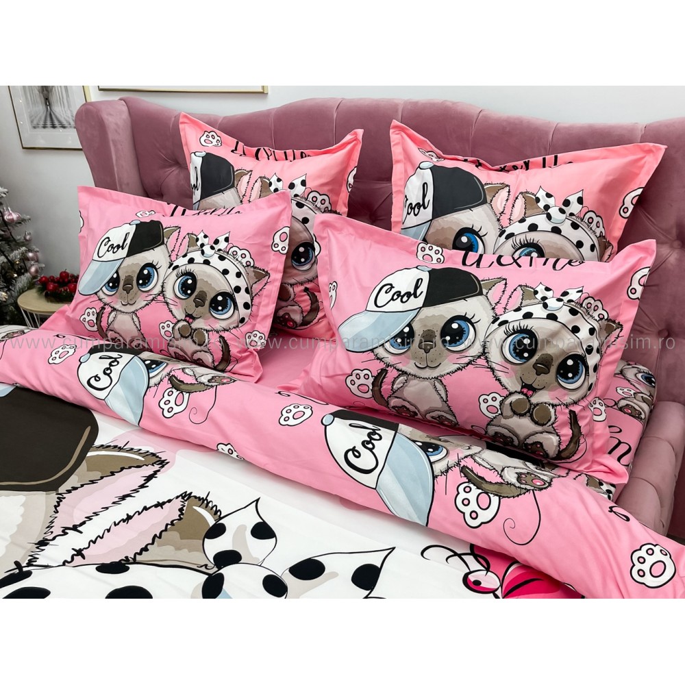 Lenjerie pat dublu, FINET, Imprimeu Digital - Identic cu poza, 6 piese, Jojo Home, Alb-Multicolor, pisici, cod produs: JOF540