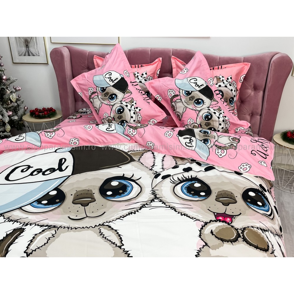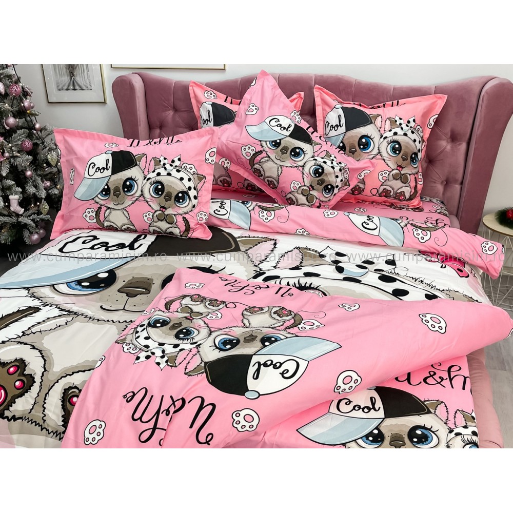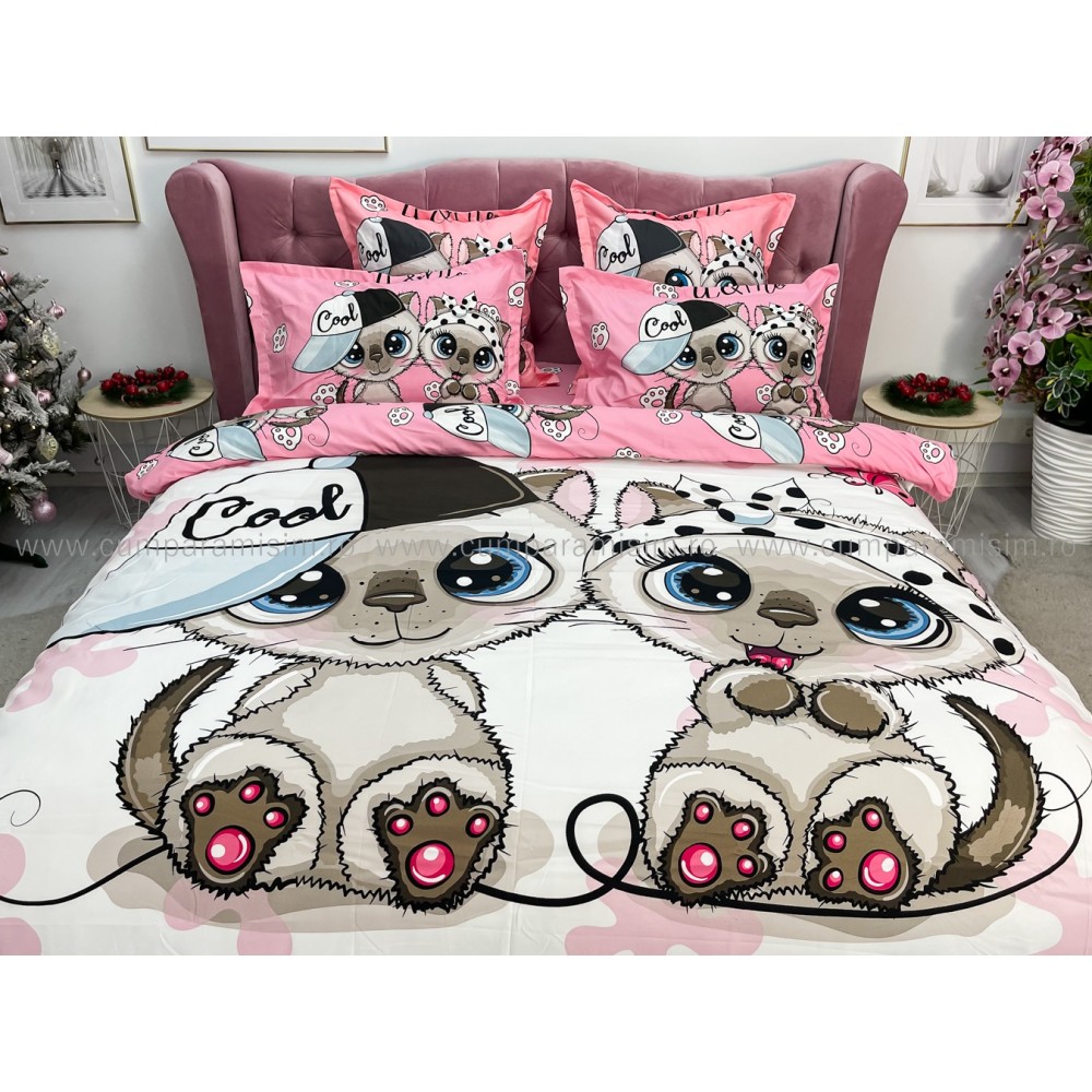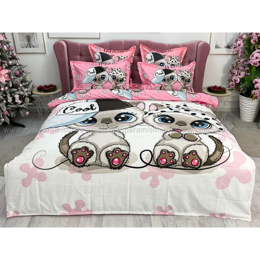 Lenjerie pat dublu, FINET, Imprimeu Digital - Identic cu poza, 6 piese, Jojo Home, Alb-Multicolor, pisici, cod produs: JOF540
