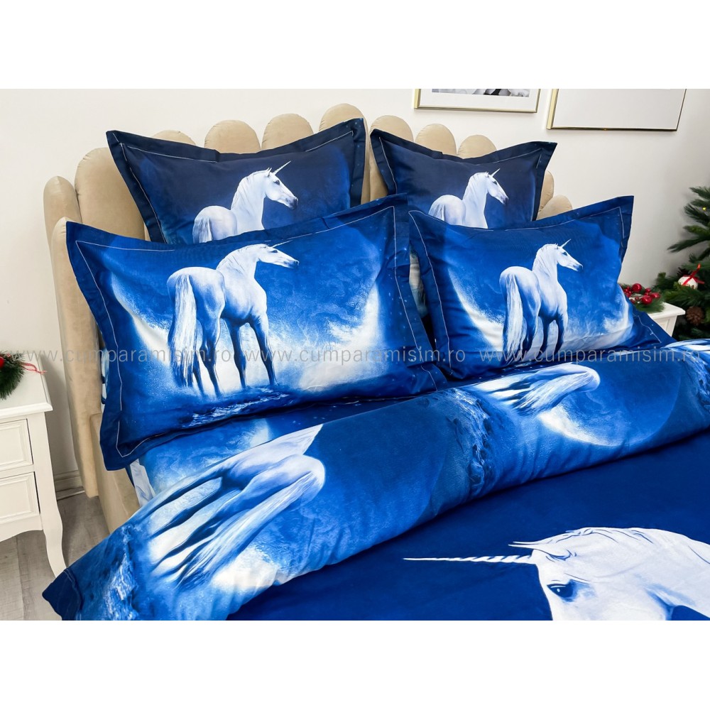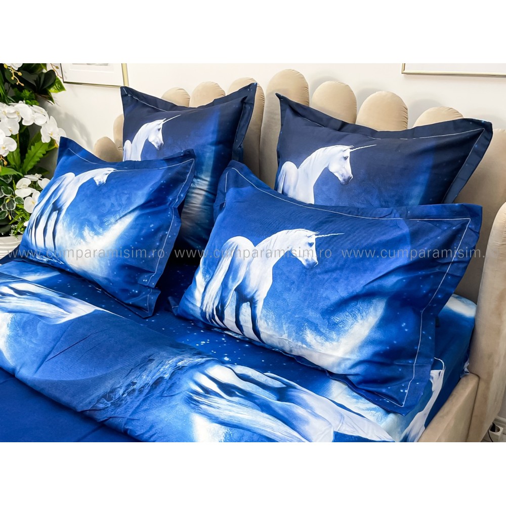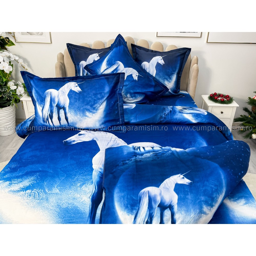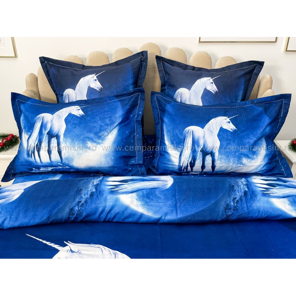 Lenjerie pat dublu, FINET, Imprimeu Digital - Identic cu poza, 6 piese, Jojo Home, Bleumarin-Alb, unicorn, cod produs: JOF502