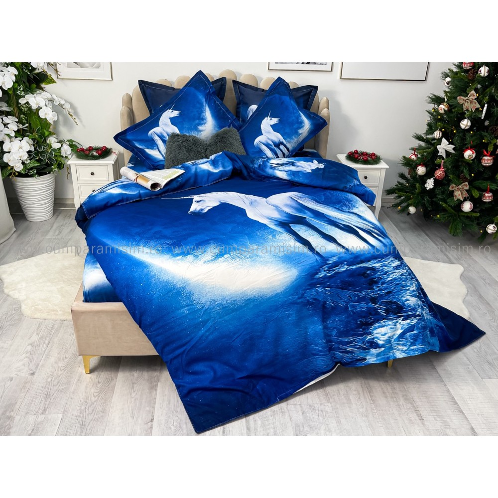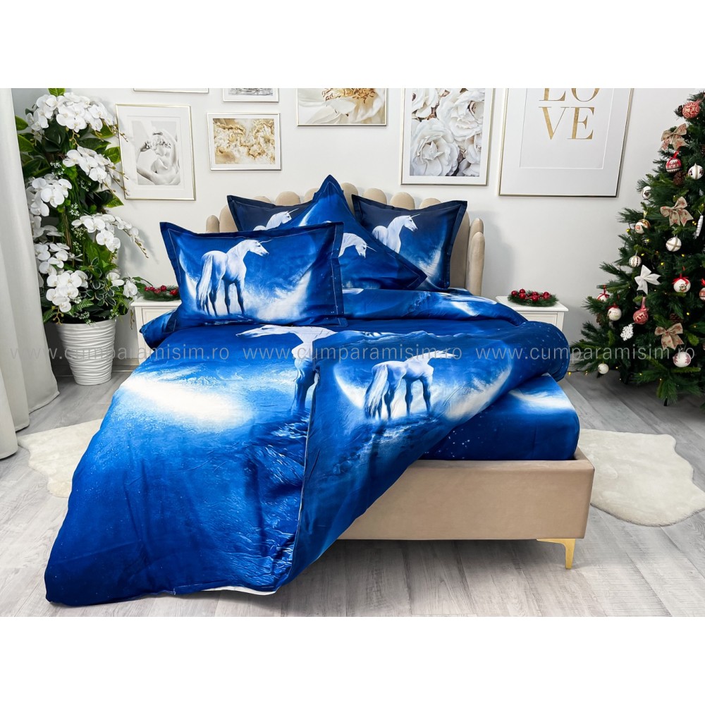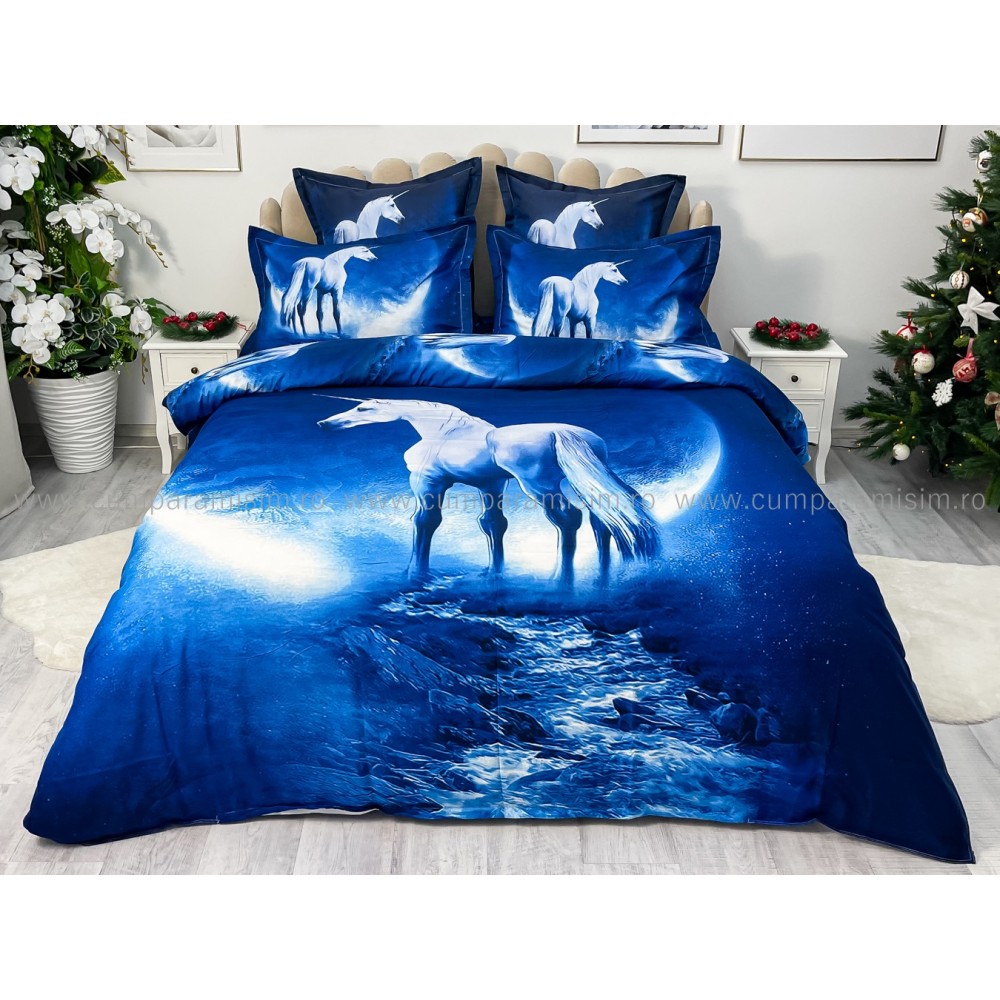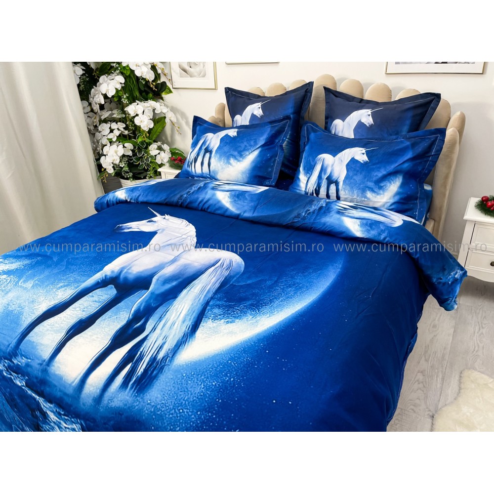 Lenjerie pat dublu, FINET, Imprimeu Digital - Identic cu poza, 6 piese, Jojo Home, Bleumarin-Alb, unicorn, cod produs: JOF502