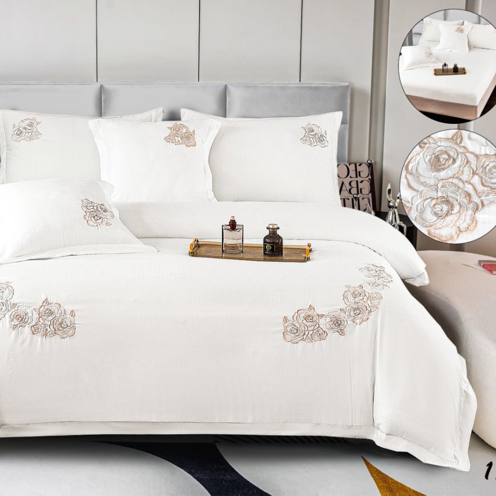Lenjerie Pat Dublu, Bumbac Neted Fin, Broderie Rafinata, CEARSAF CU ELASTIC, 6 piese, Alb, Casa Minunata, cod produs: INS-BFB12