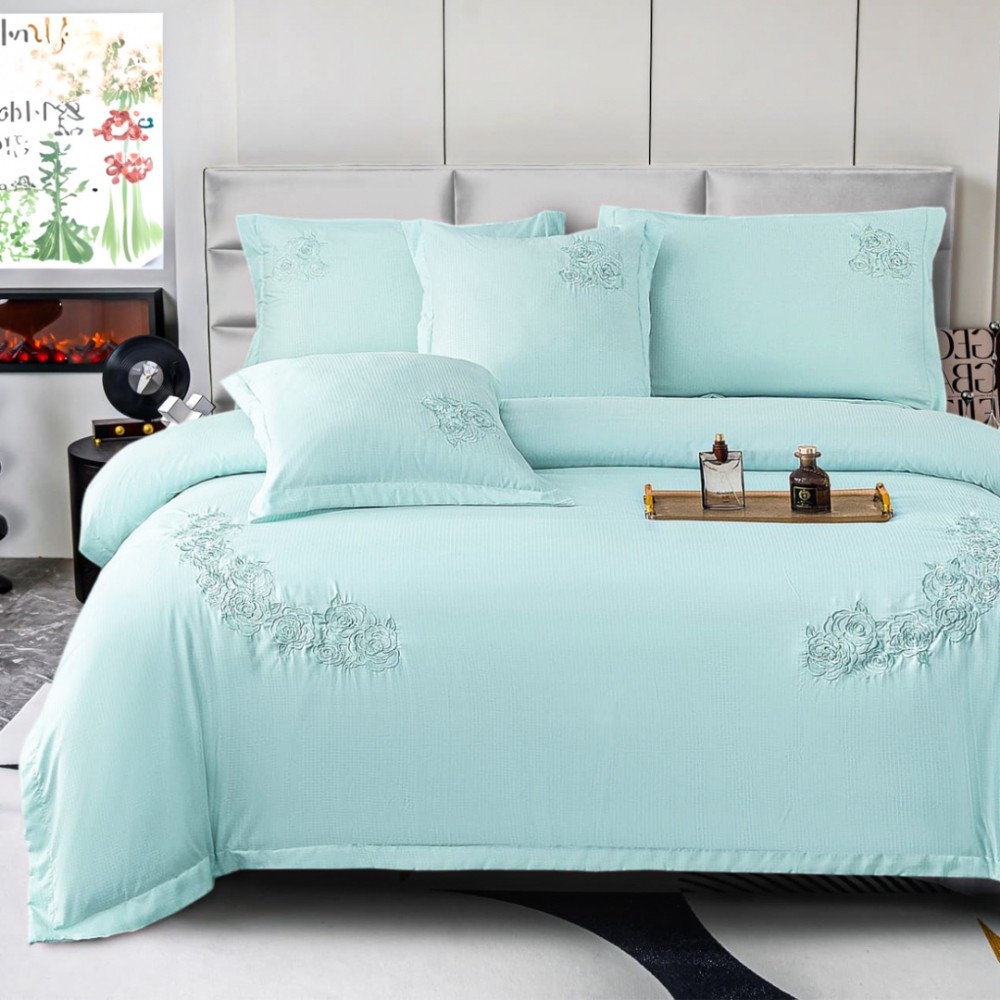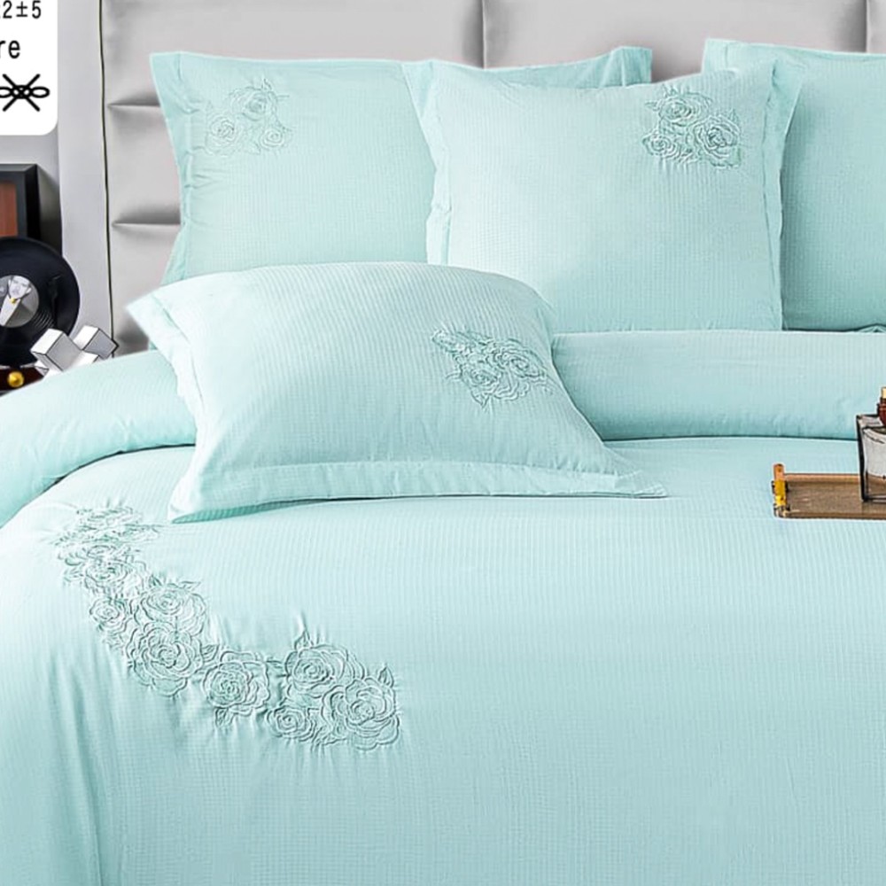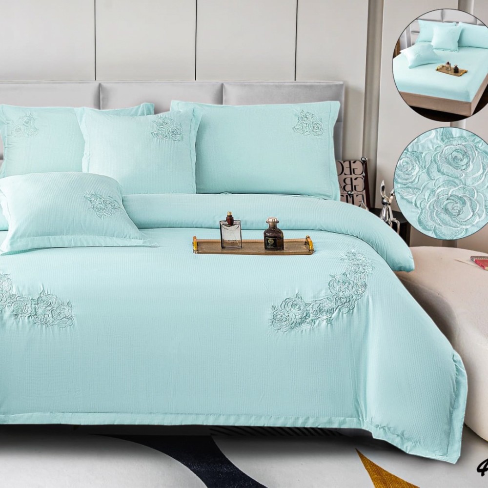 Lenjerie Pat Dublu, Bumbac Neted Fin, Broderie Rafinata, CEARSAF CU ELASTIC, 6 piese, Bleu Ciel, Casa Minunata, cod produs: INS-BFB15