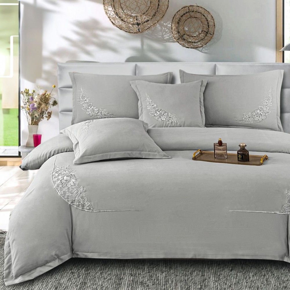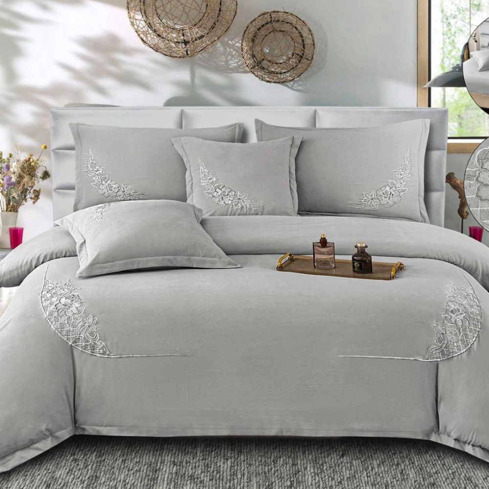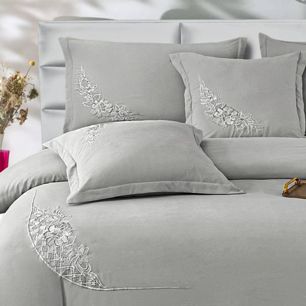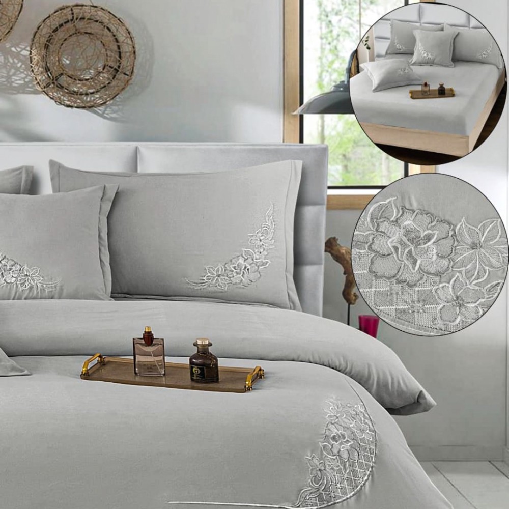 Lenjerie Pat Dublu, Bumbac Neted Fin, Broderie Rafinata, CEARSAF CU ELASTIC, 6 piese, Gri, Casa Minunata, cod produs: INS-BFB01