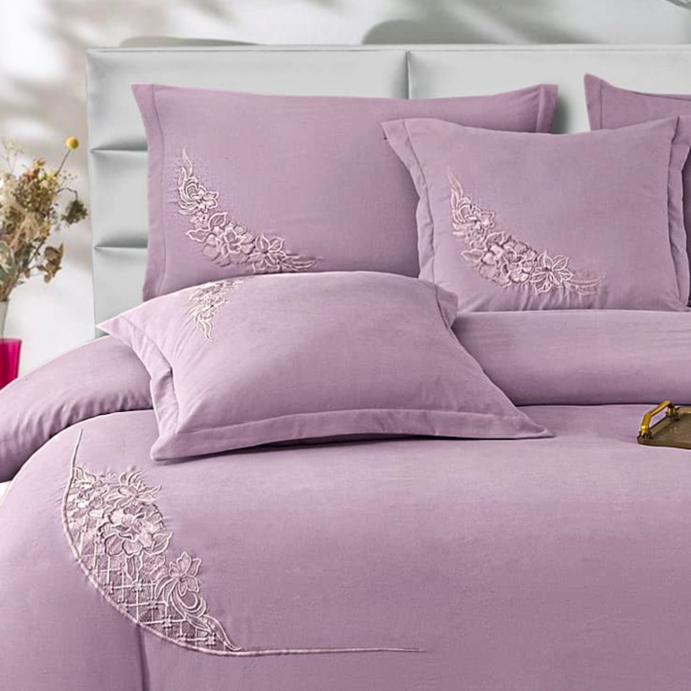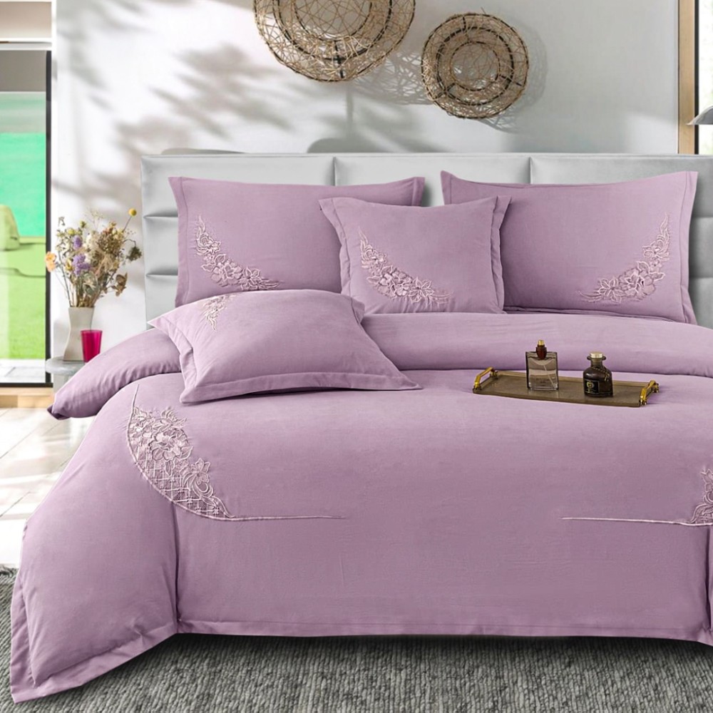 Lenjerie Pat Dublu, Bumbac Neted Fin, Broderie Rafinata, CEARSAF CU ELASTIC, 6 piese, Lila, Casa Minunata, cod produs: INS-BFB04