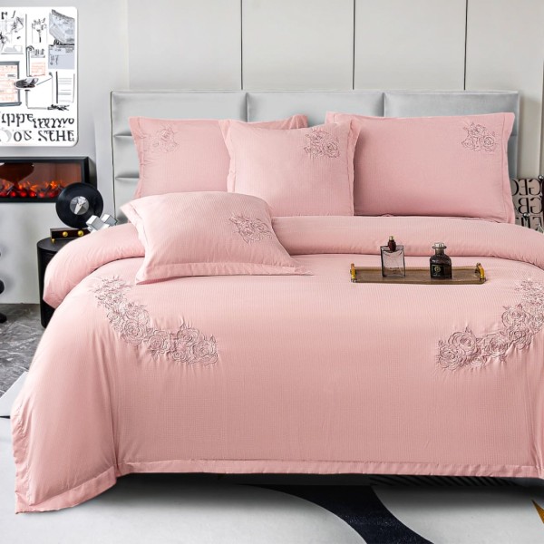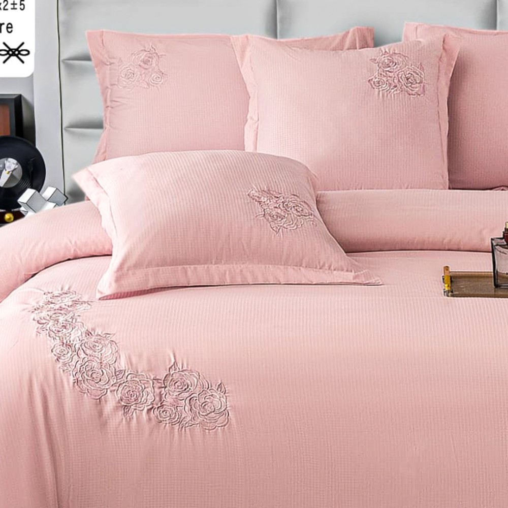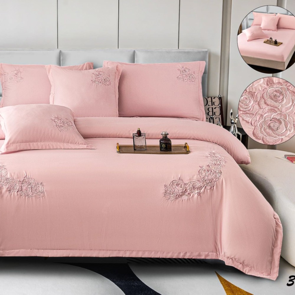 Lenjerie Pat Dublu, Bumbac Neted Fin, Broderie Rafinata, CEARSAF CU ELASTIC, 6 piese, Roz, Casa Minunata, cod produs: INS-BFB11