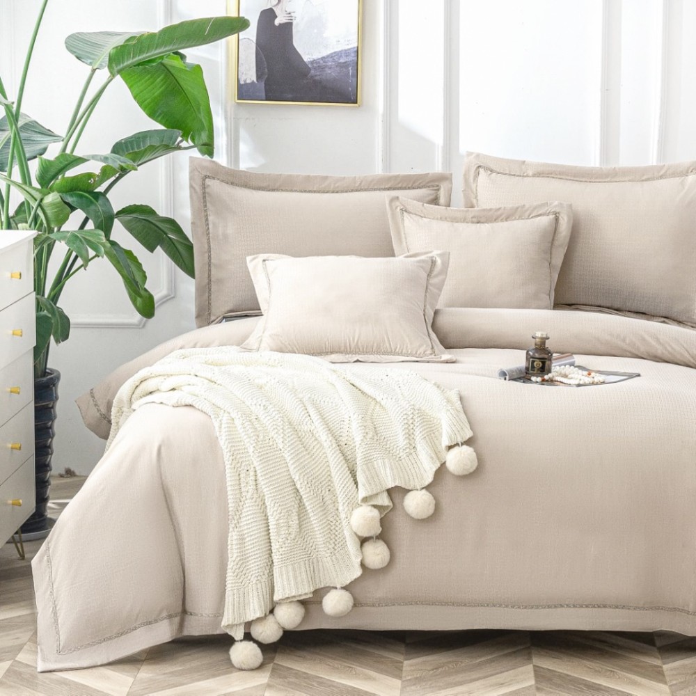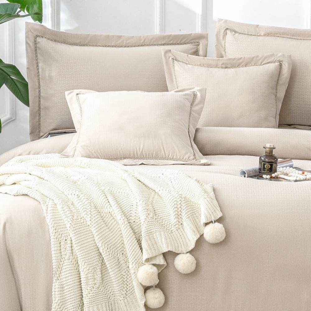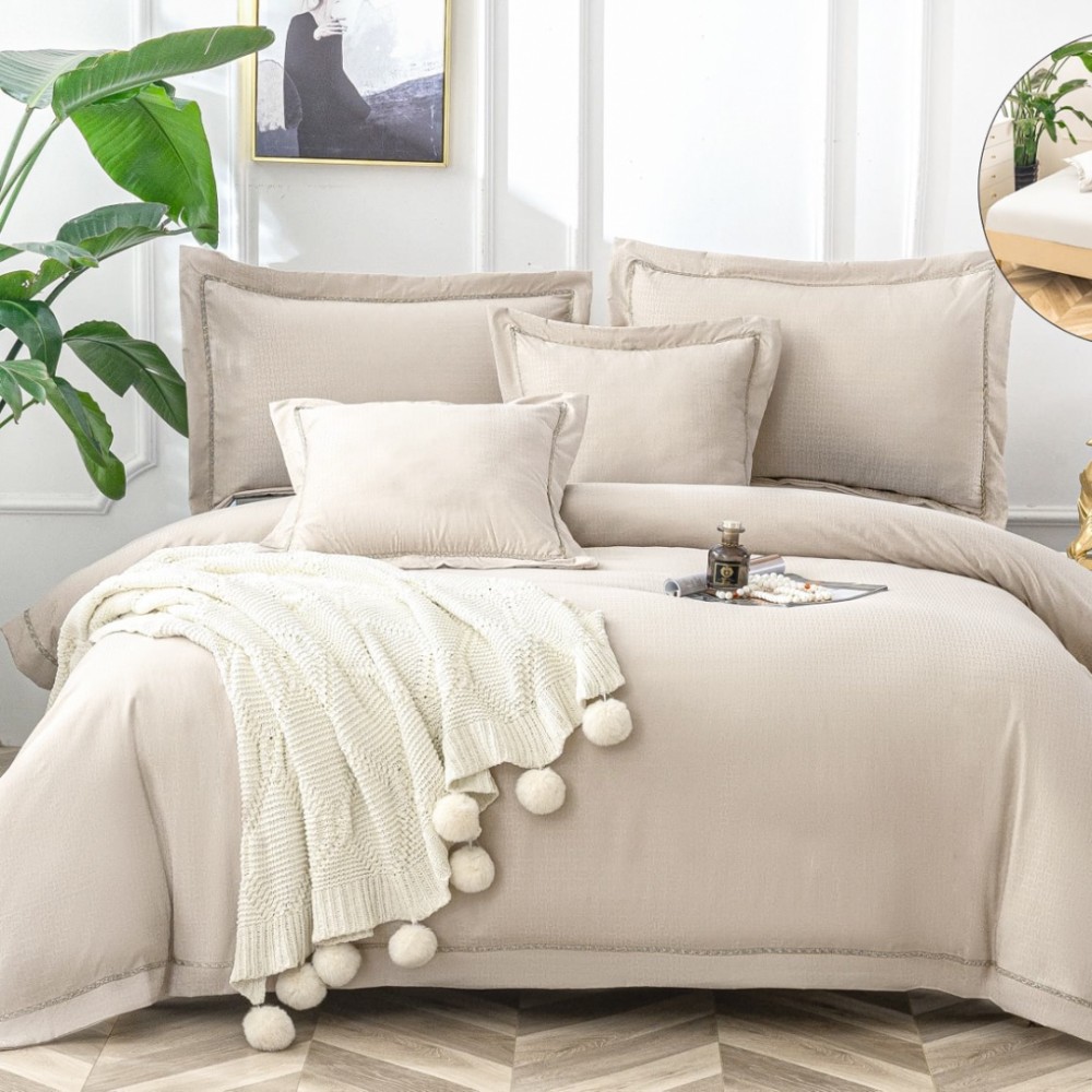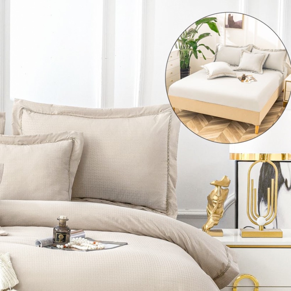 Lenjerie Pat Dublu, Bumbac Neted Fin, cu Bordura din Broderie Rafinata, CEARSAF CU ELASTIC, 6 piese, Bej, Casa Minunata, cod produs: INS-BNB06