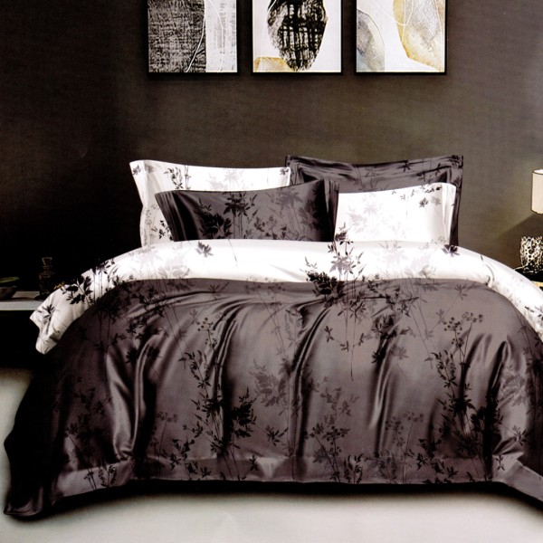 Lenjerie pat dublu, bumbac satinat, cu doua feţe, 4 piese, Alb, Negru, Crenguțe cu Frunze, Casa Creativ Elegant Pucioasa, cod produs: BCC-LBS82