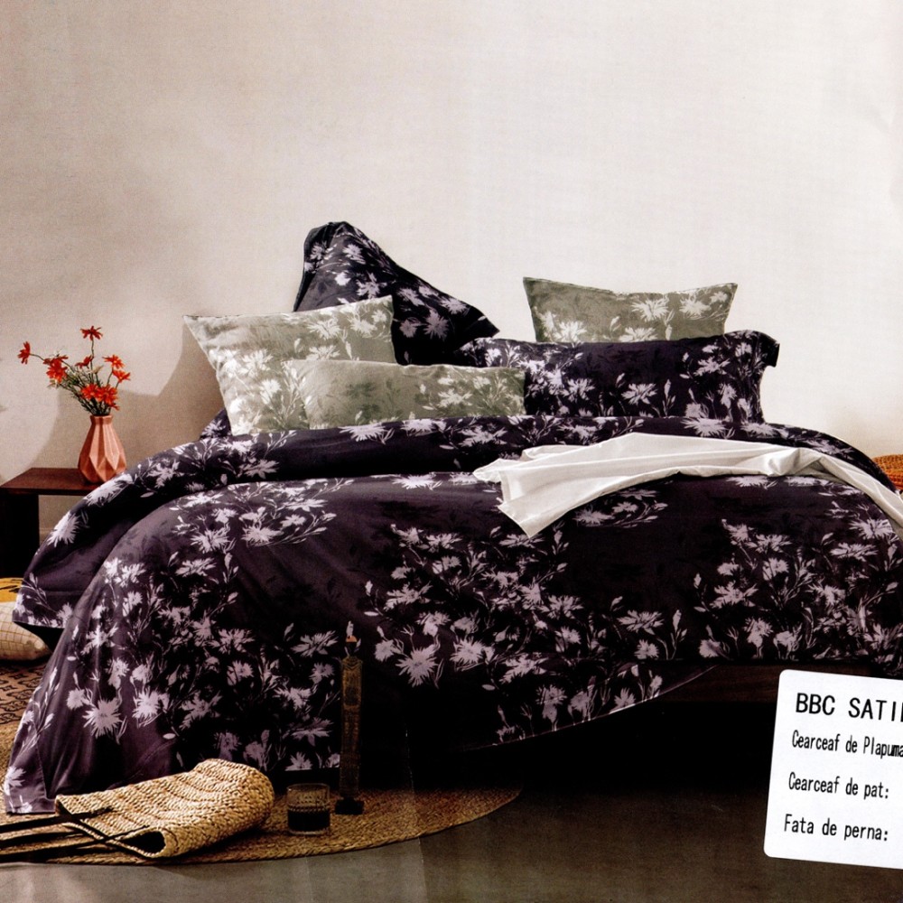 Lenjerie pat dublu, bumbac satinat, cu doua feţe, 4 piese, Bleumarin, Gri, Flori, Casa Creativ Elegant Pucioasa, cod produs: BCC-LBS98