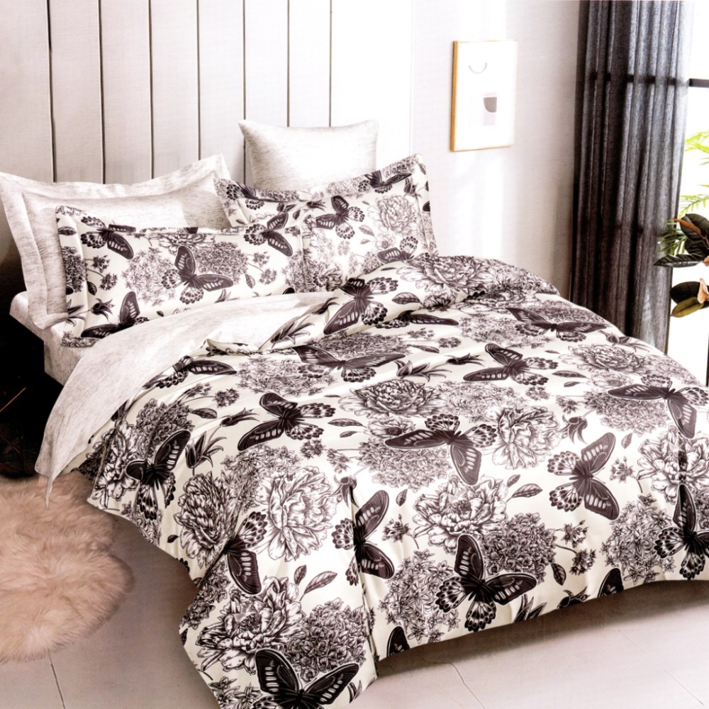 Lenjerie pat dublu, bumbac satinat, cu doua feţe, 4 piese, Gri, Negru, Flori, Fluturi, Casa Creativ Elegant Pucioasa, cod produs: BCC-LBS69