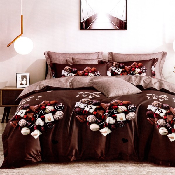 Lenjerie pat dublu, bumbac satinat, cu doua feţe, 4 piese, Maro, Bomboane de Ciocolata, Inimioare, Casa Creativ Elegant Pucioasa, cod produs: BCC-LBS92