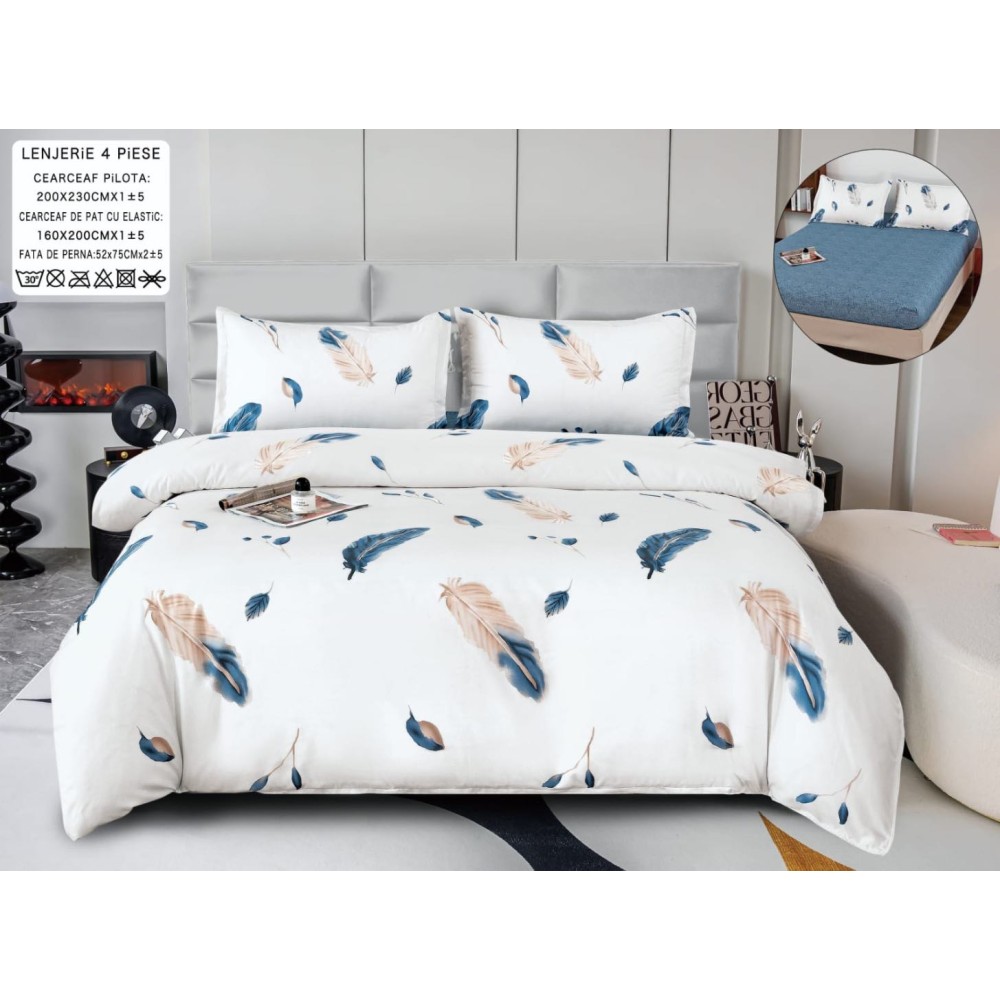 Lenjerie pat dublu, bumbac satinat, Cearșaf cu ELASTIC 160x200cm, 4 PIESE, Alb, pene, CumparaMisim, cod produs: INS-LS-507