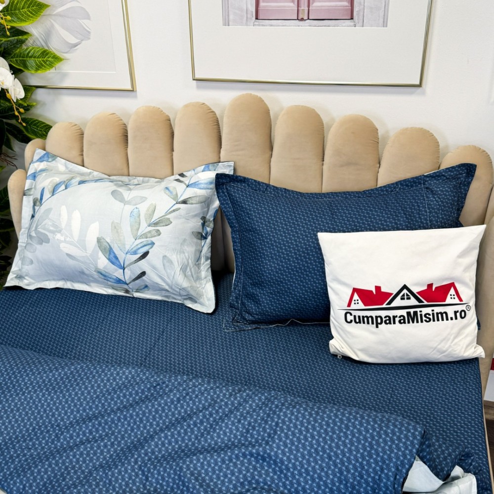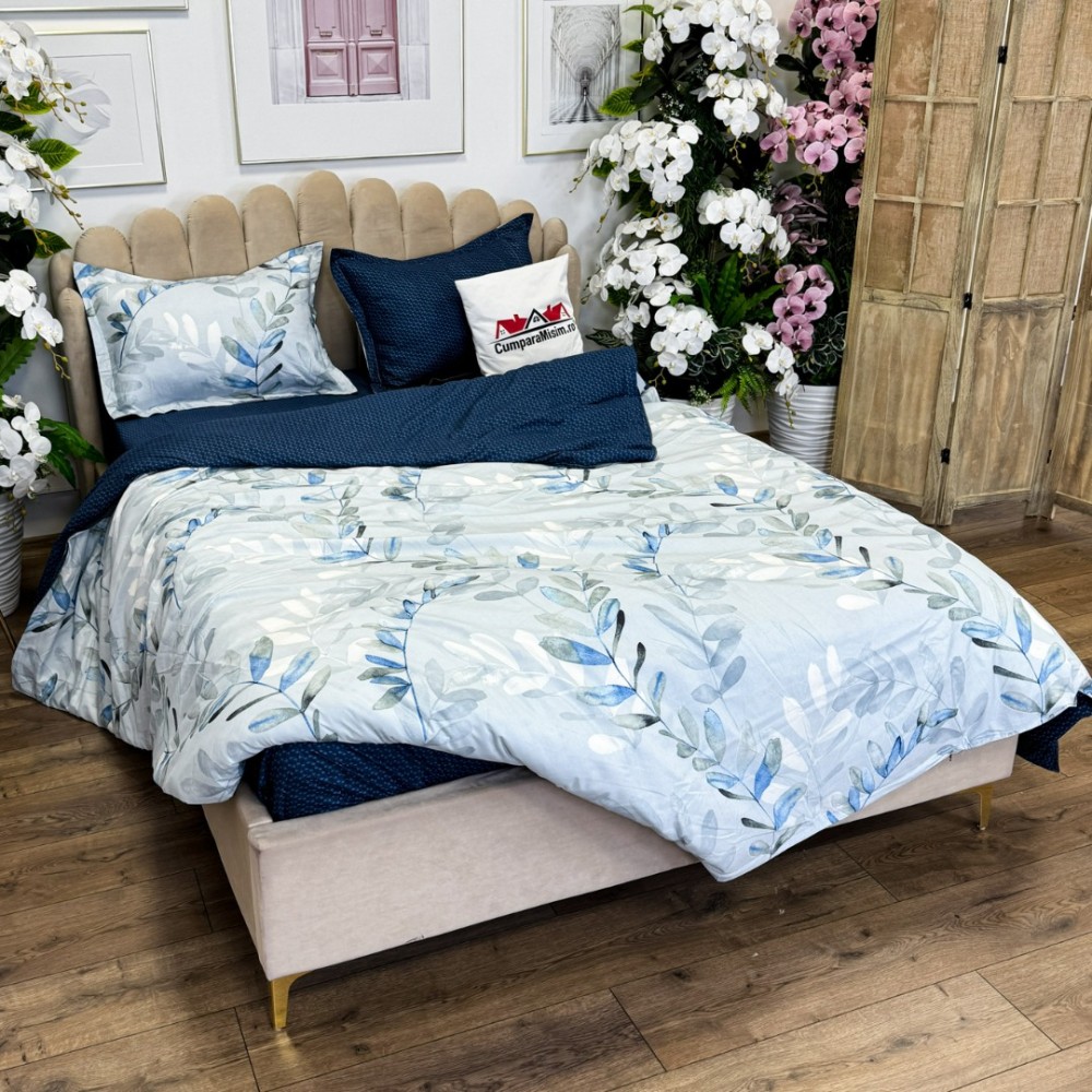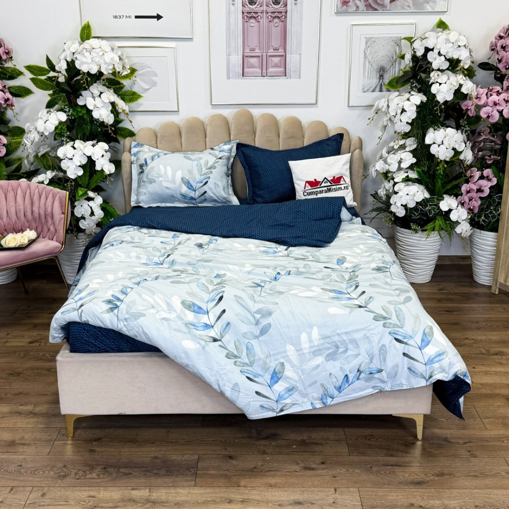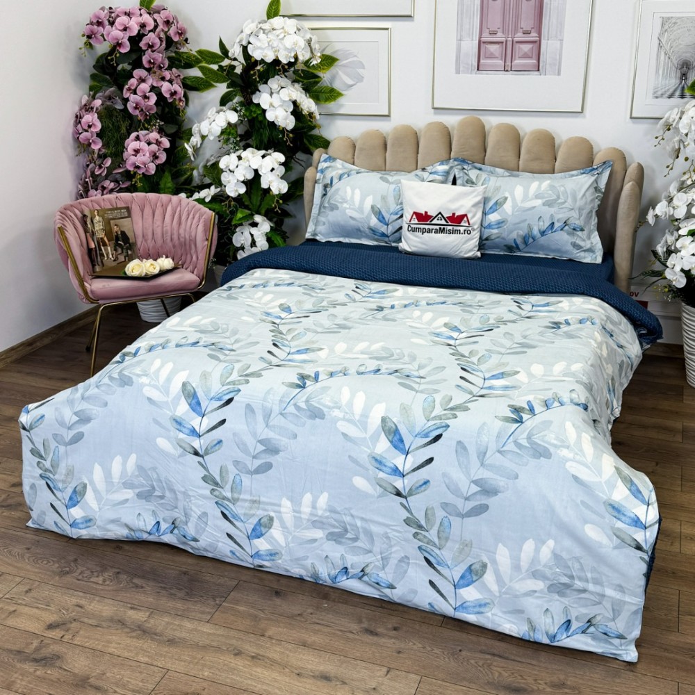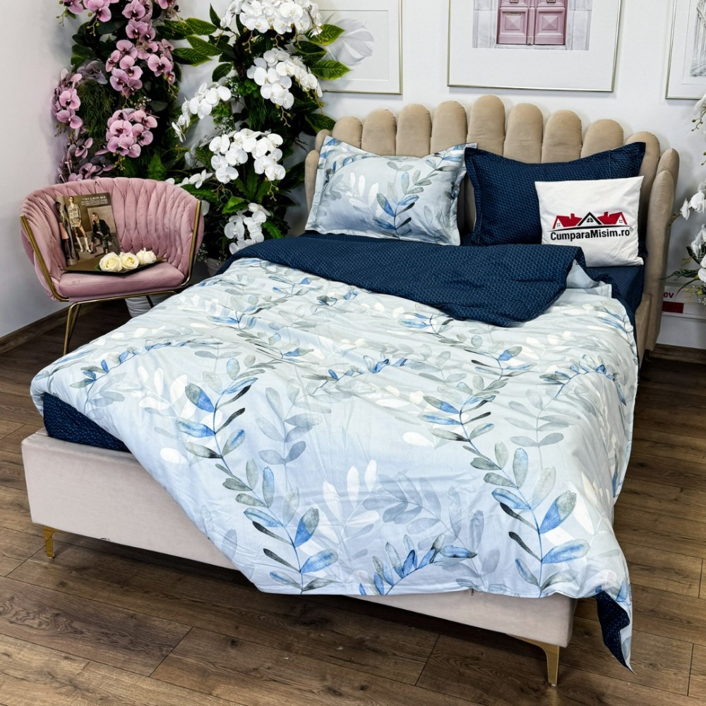 Lenjerie pat dublu, bumbac satinat, Cearșaf cu ELASTIC 180x200cm, 4 PIESE, Bleu-Bleumarin, frunze, CumparaMisim, cod produs: INS-LS-171