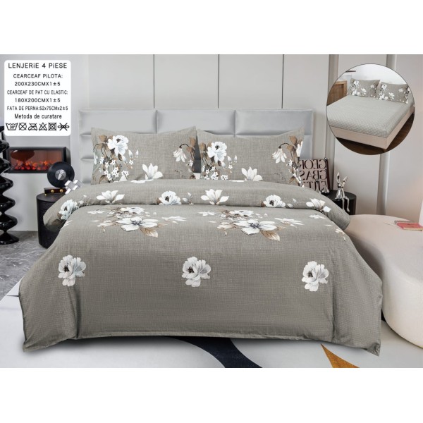 Lenjerie pat dublu, bumbac satinat, Cearșaf cu ELASTIC 180x200cm, 4 PIESE, Grej, flori, CumparaMisim, cod produs: INS-LS-159