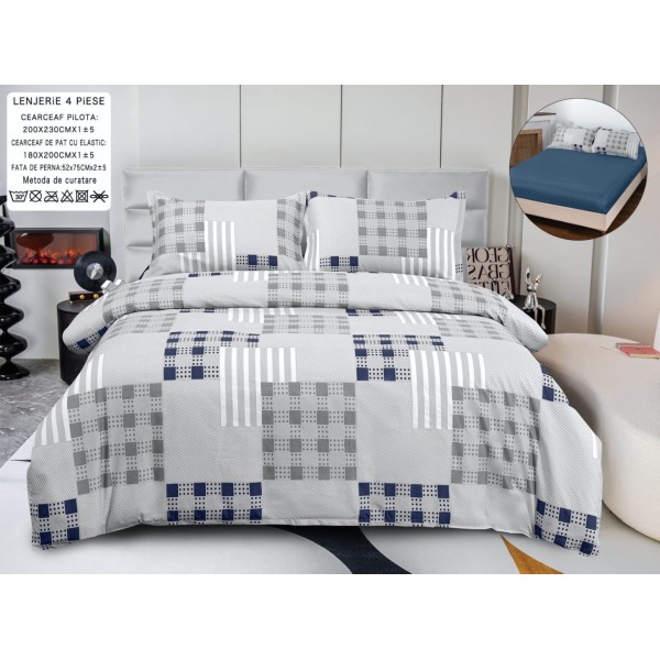 Lenjerie pat dublu, bumbac satinat, Cearșaf cu ELASTIC 180x200cm, 4 PIESE, Gri, carouri, CumparaMisim, cod produs: INS-LS-167