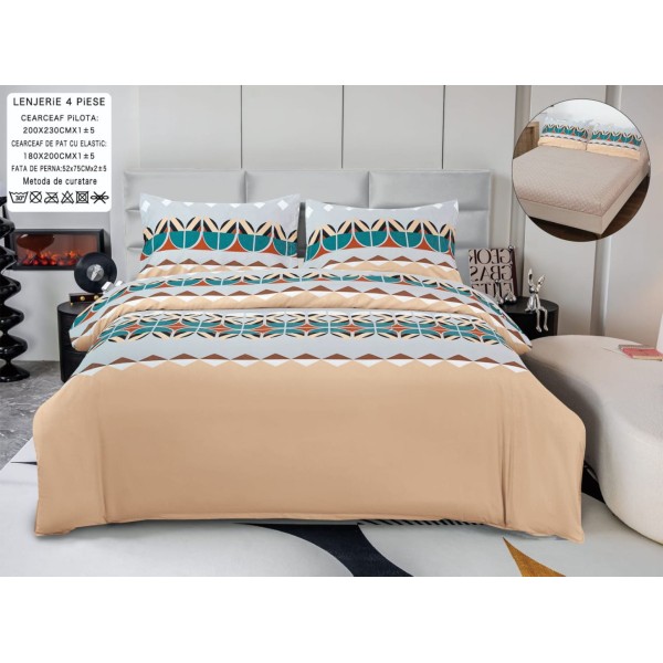 Lenjerie pat dublu, bumbac satinat, Cearșaf cu ELASTIC 180x200cm, 4 PIESE, Gri, Verde, Bej, clasic, CumparaMisim, cod produs: INS-LS-152