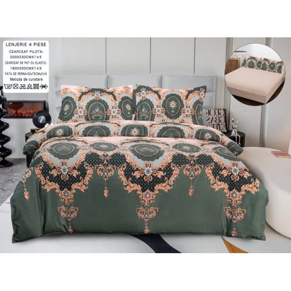 Lenjerie pat dublu, bumbac satinat, Cearșaf cu ELASTIC 180x200cm, 4 PIESE, Verde, Bej, oriental, CumparaMisim, cod produs: INS-LS-151