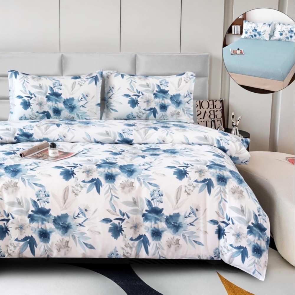 Lenjerie pat dublu, bumbac satinat, cu ELASTIC, 4 PIESE, albastru, flori, CumparaMisim, cod produs: INS-LS-126