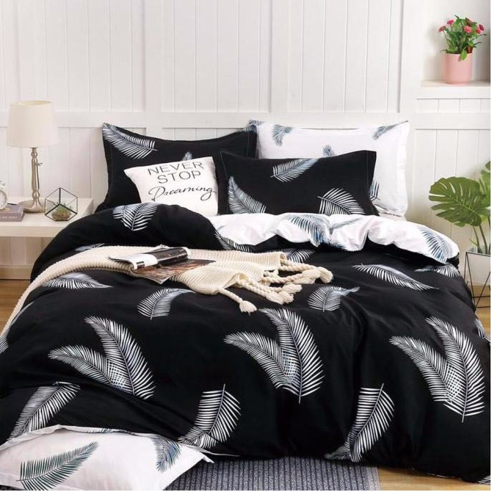 Lenjerie pat dublu, Finet Soft, cu ELASTIC, 4 PIESE, Negru, frunze, CumparaMisim, cod produs: YY-FSE-25