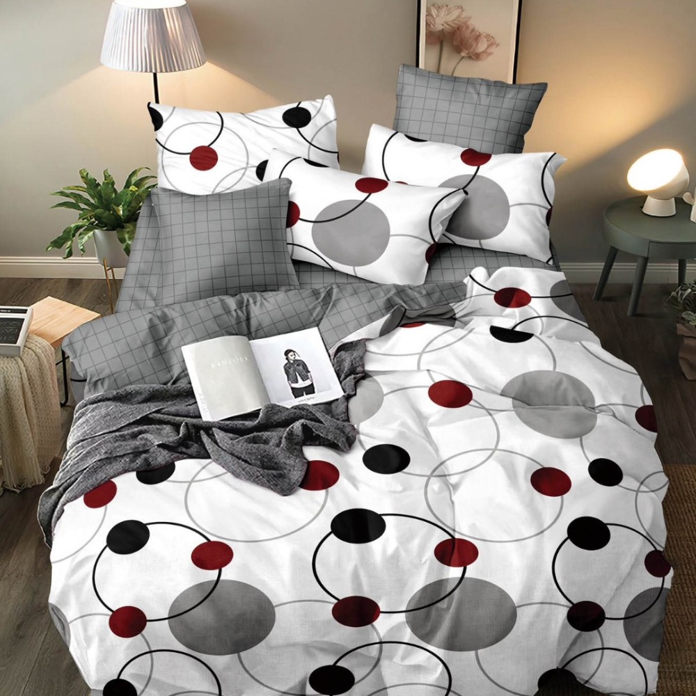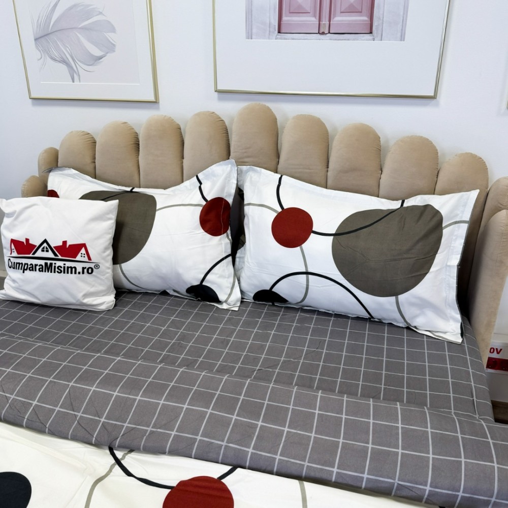 Lenjerie pat dublu, bumbac satinat, cu elastic, Alb, Gri, buline, Johny Home Pucioasa, cod produs: SPR-E-145