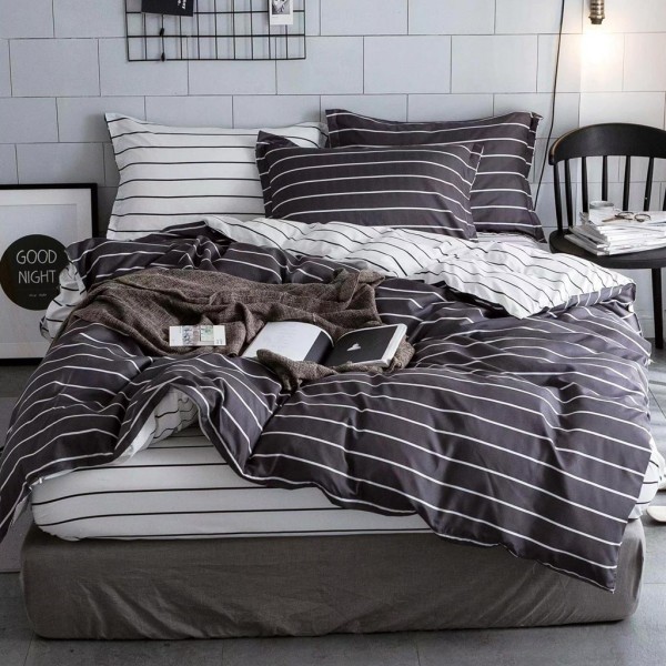 Lenjerie pat dublu, bumbac satinat, cu elastic, alb, gri, dungi, Johny Home Pucioasa, cod produs: SPR-E-99