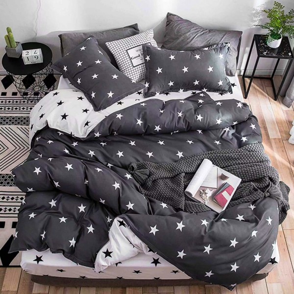 Lenjerie pat dublu, bumbac satinat, cu elastic, Alb, Gri, stelute, Johny Home Pucioasa, cod produs: SPR-E-132