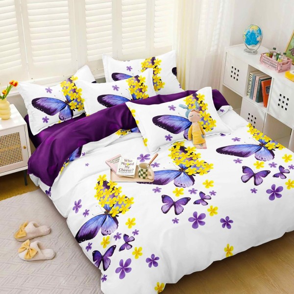 Lenjerie pat dublu, bumbac satinat, cu elastic, Alb, Mov, fluturi, Johny Home Pucioasa, cod produs: SPR-E-126