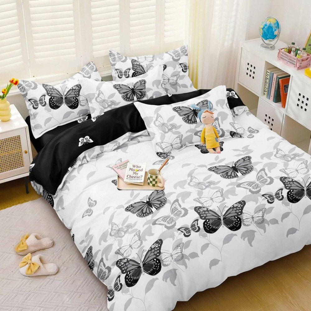 Lenjerie pat dublu, bumbac satinat, cu elastic, Alb, Negru, fluturi, Johny Home Pucioasa, cod produs: SPR-E-108