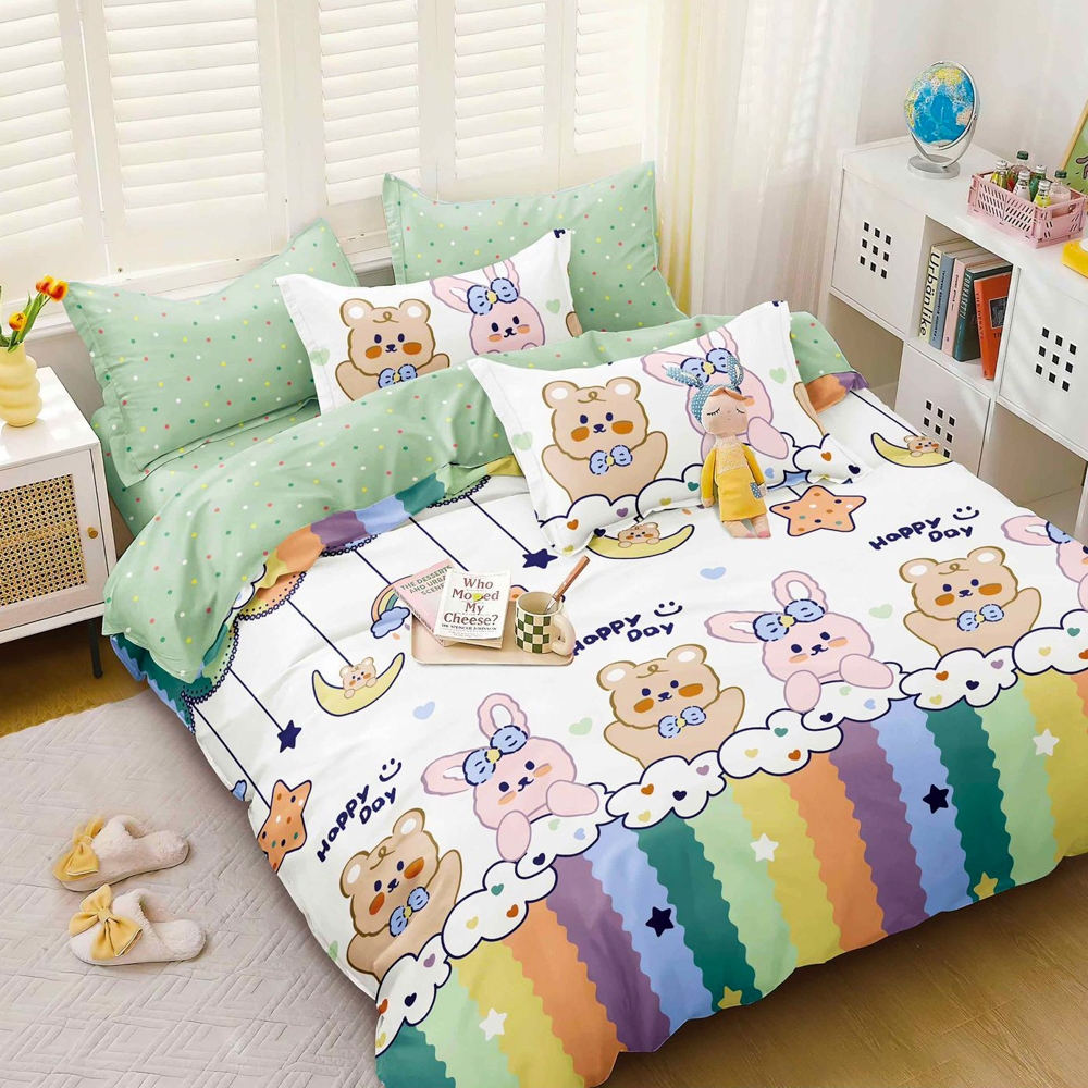 Lenjerie pat dublu, bumbac satinat, cu elastic, Alb, Verde, iepurasi, Johny Home Pucioasa, cod produs: SPR-E-124