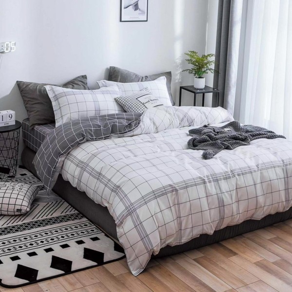 Lenjerie pat dublu, bumbac satinat, cu elastic, Gri, Alb, patratele, Johny Home Pucioasa, cod produs: SPR-E-105