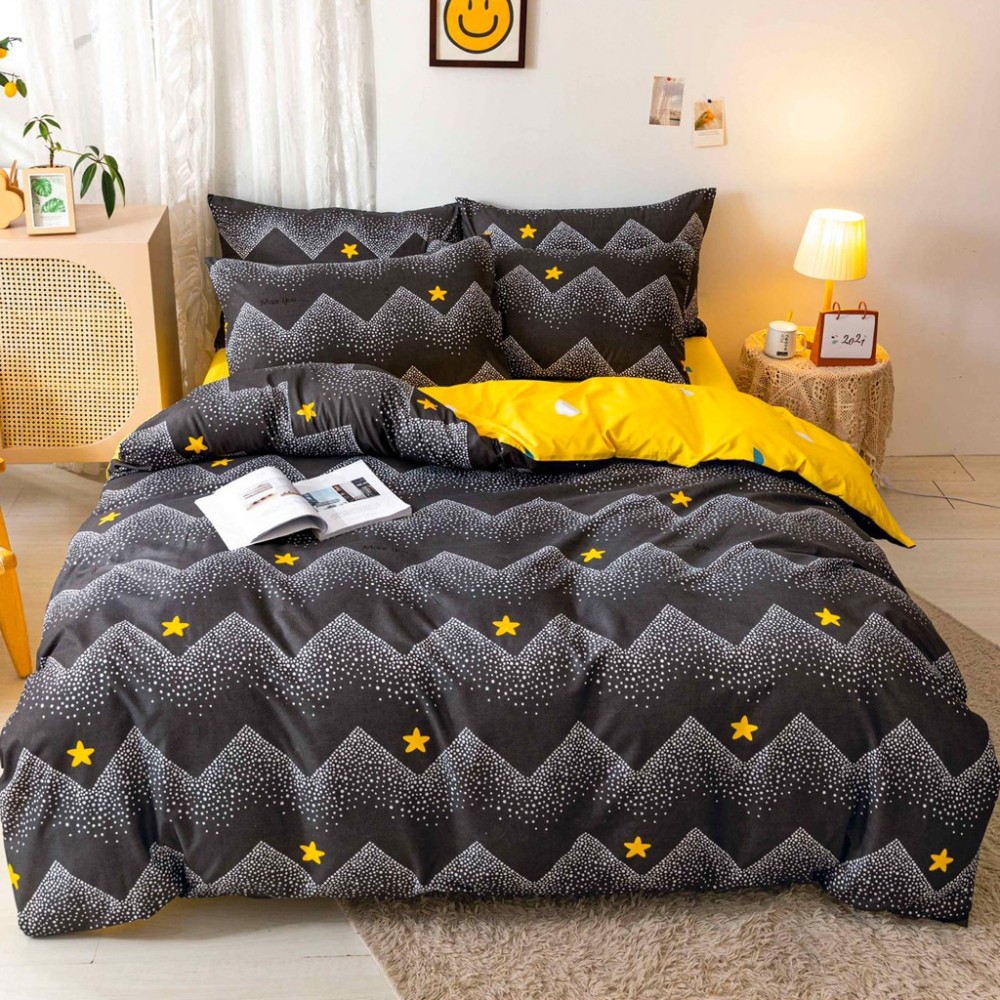 Lenjerie pat dublu, bumbac satinat, cu elastic, Negru, Galben, stelute, Johny Home Pucioasa, cod produs: SPR-E-110