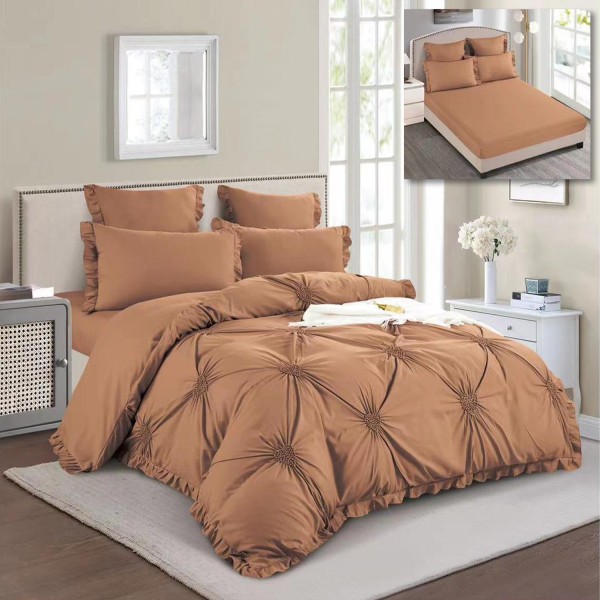 Lenjerie pat dublu, Soft Touch, 6 piese, ELASTIC, cu VOLANASE si INIMIOARE BRODATE, Maro, Johny Home Pucioasa, cod produs: SPR-T1-01