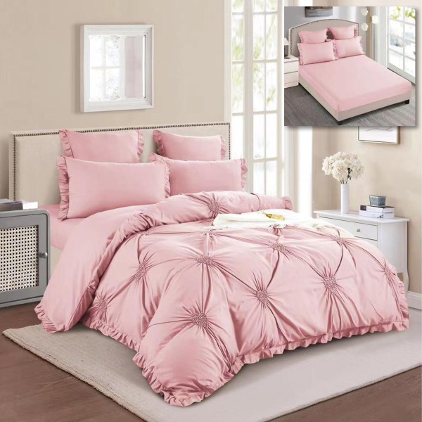 Lenjerie pat dublu, Soft Touch, 6 piese, ELASTIC, cu VOLANASE si INIMIOARE BRODATE, Roz, Johny Home Pucioasa, cod produs: SPR-T1-08