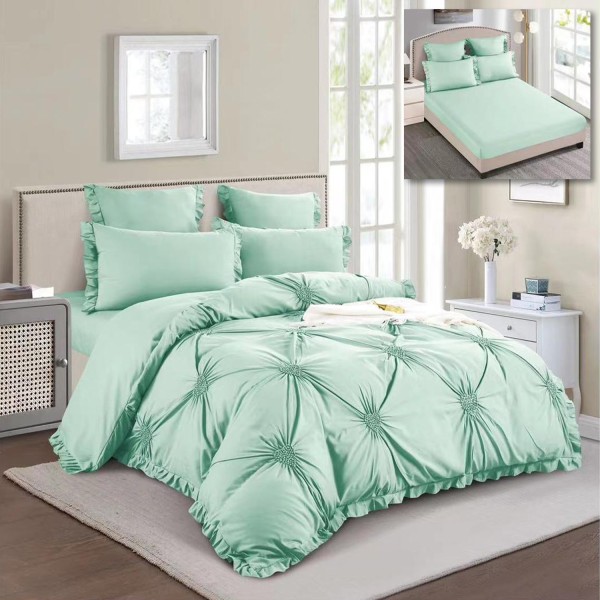 Lenjerie pat dublu, Soft Touch, 6 piese, ELASTIC, cu VOLANASE si INIMIOARE BRODATE, Verde aqua, Johny Home Pucioasa, cod produs: SPR-T1-12