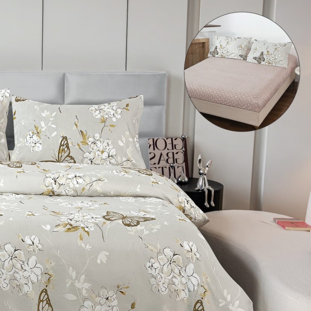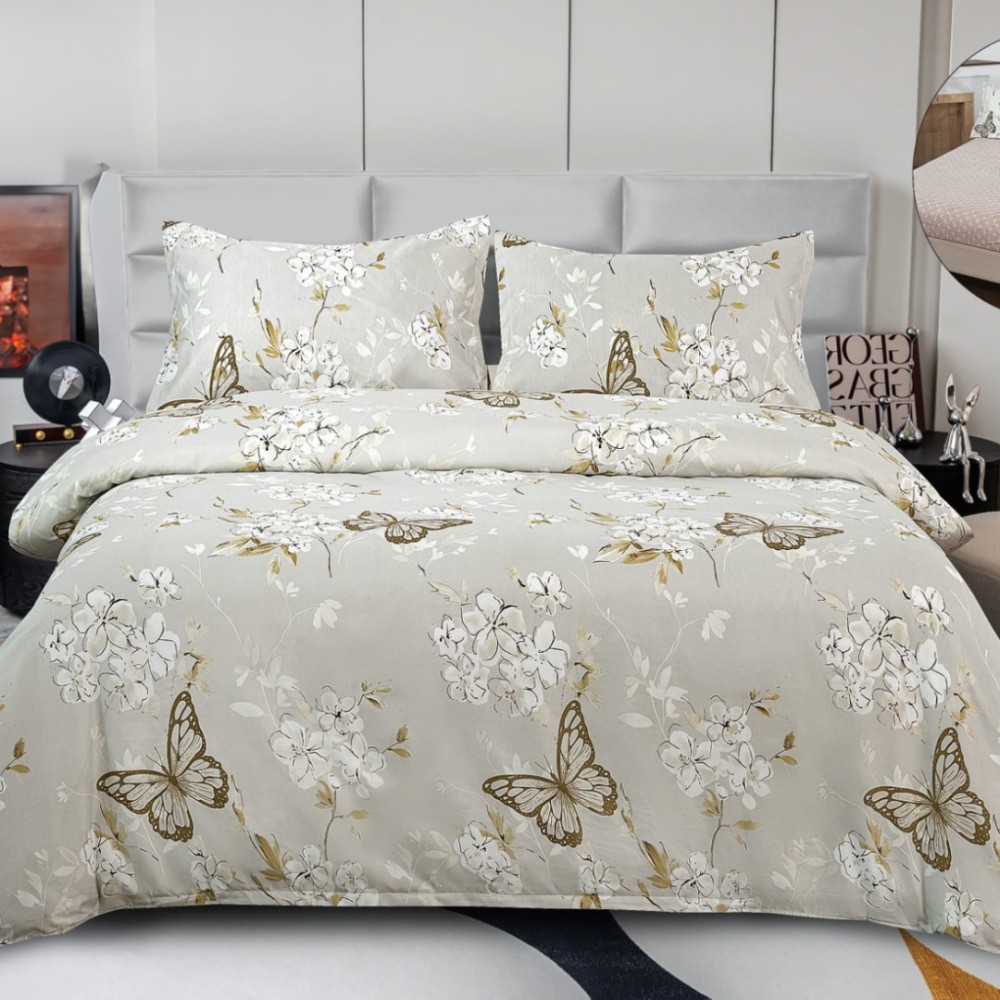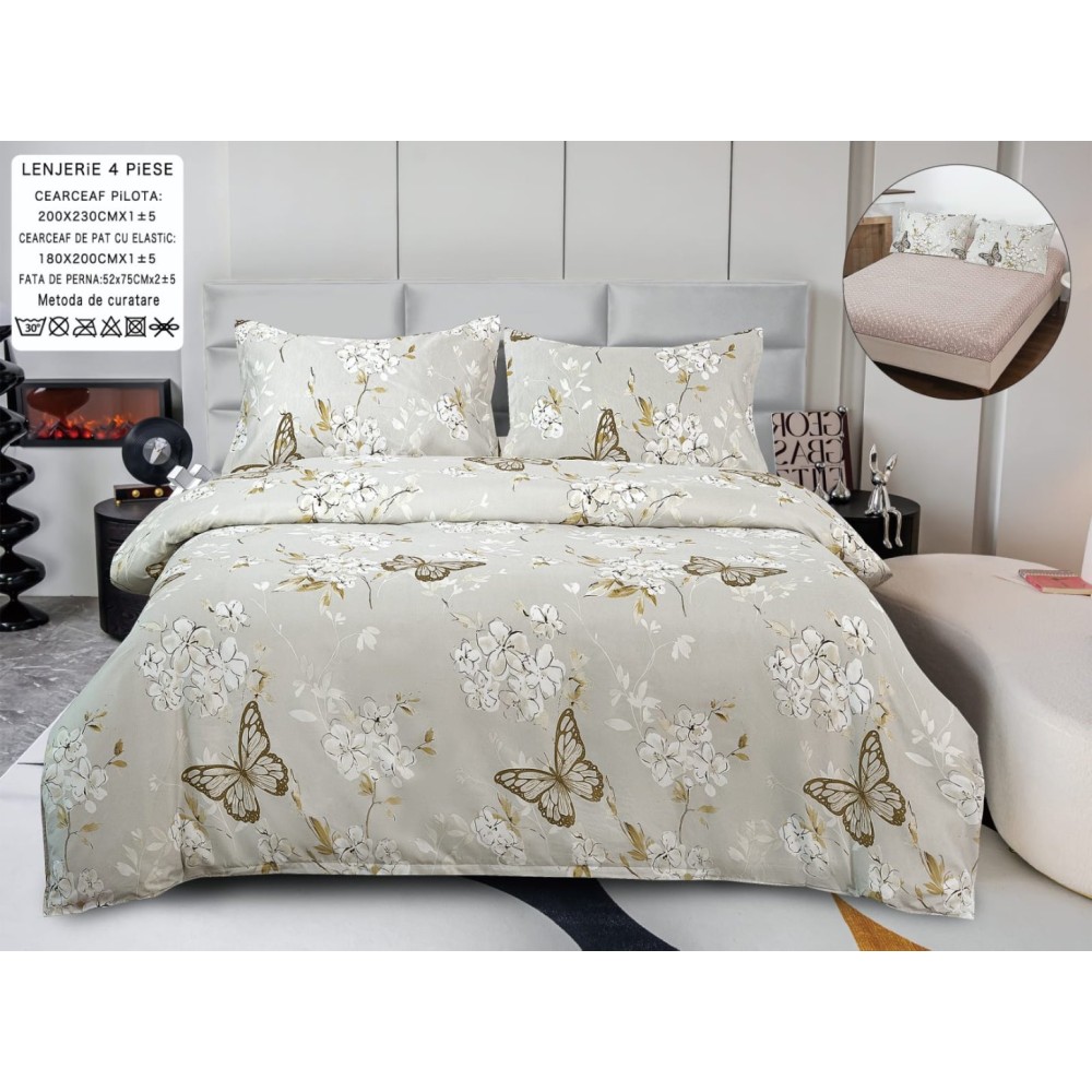 Lenjerie pat dublu, bumbac satinat, Cearșaf cu ELASTIC 180x200cm, 4 PIESE, Bej, Flori si Fluturi, CumparaMisim, cod produs: INS-LS-174