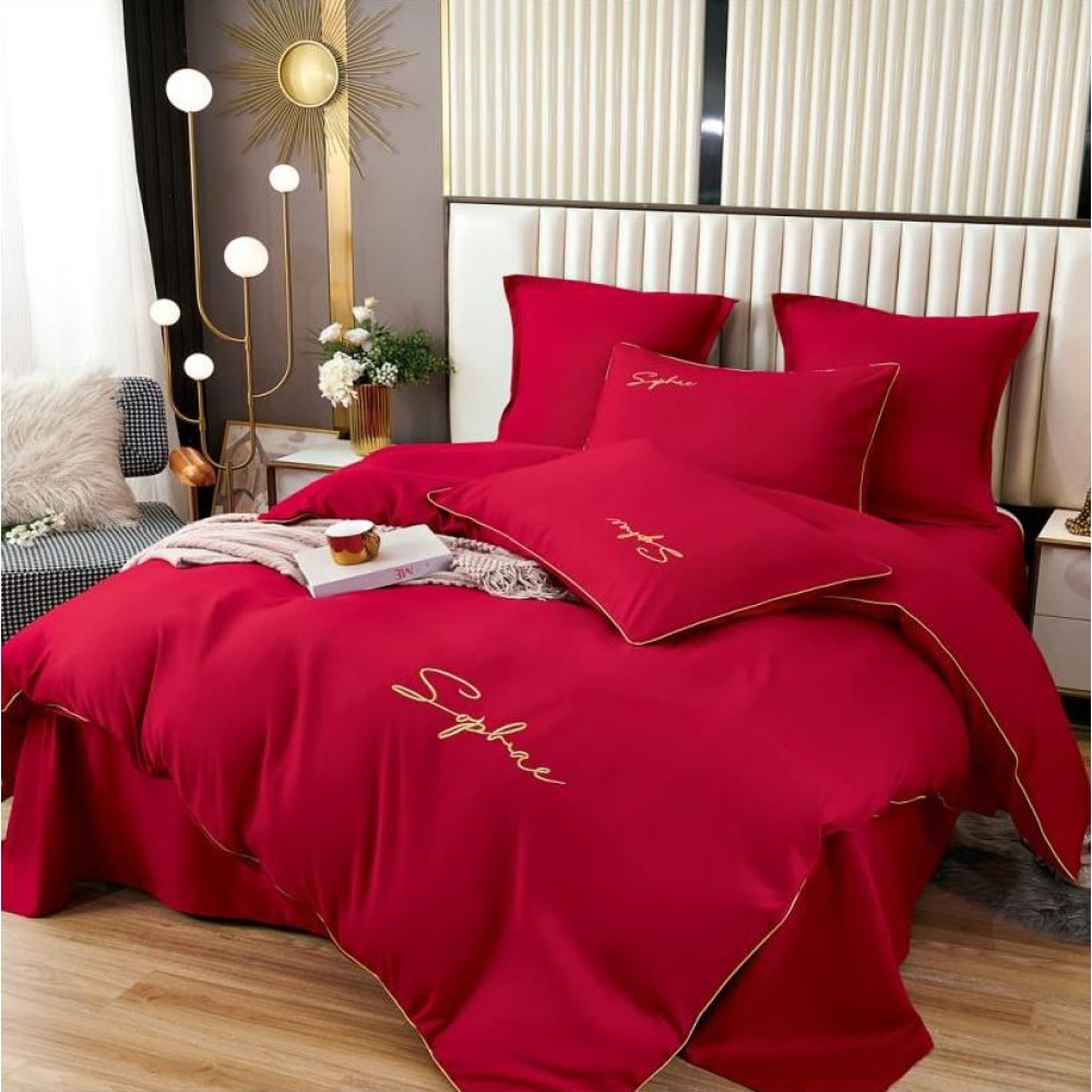Lenjerie pat dublu cu broderie, Bumbac Satinat Deluxe, 6 piese, Rosu, CumparaMisim, cod produs: SKB12